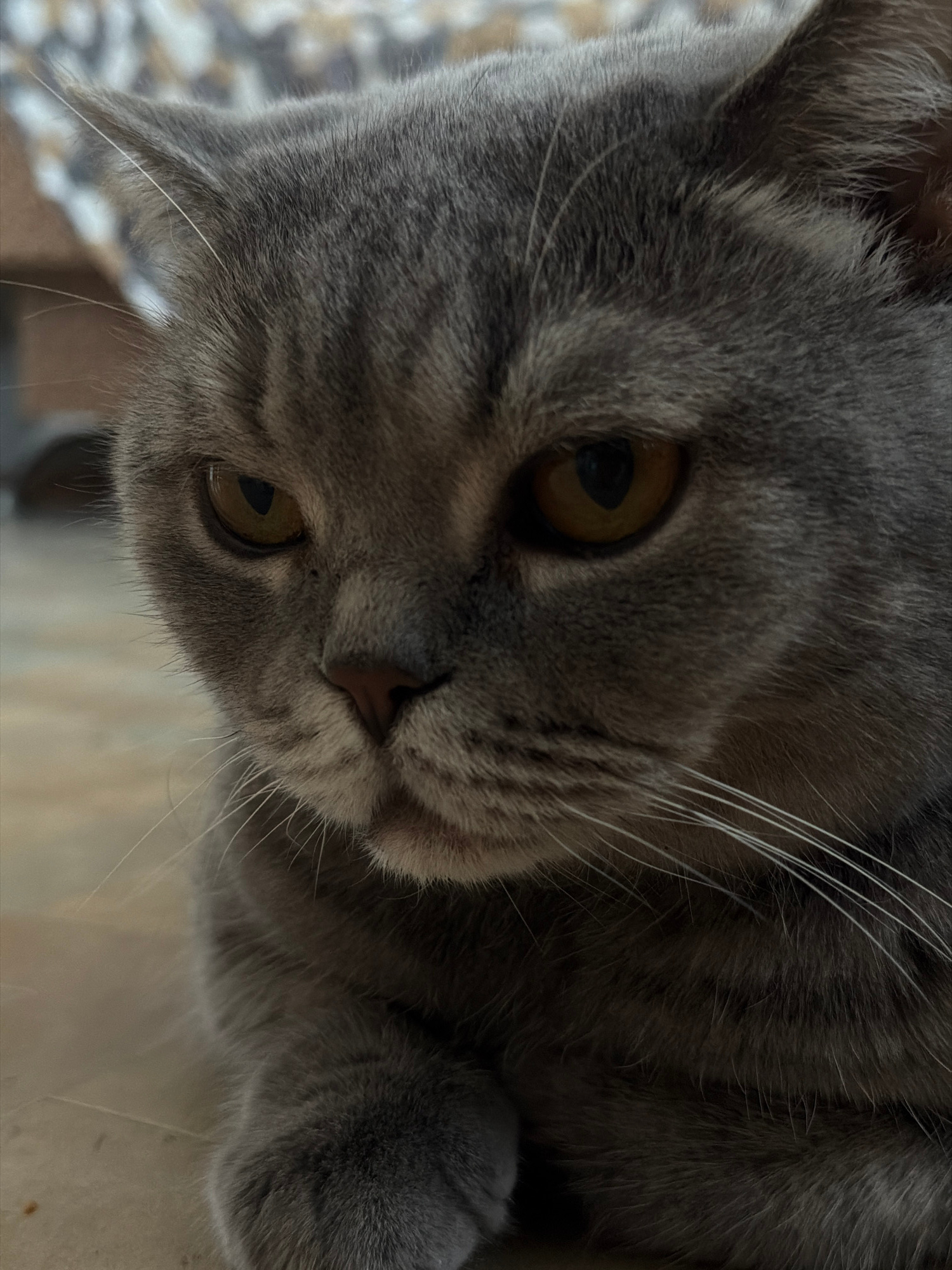 A close-up, horizontally oriented portrait captures the serene face of a domestic cat. The feline subject has dense, short grey fur with subtle tabby-like stripes visible on its head and cheeks. Its l…read more