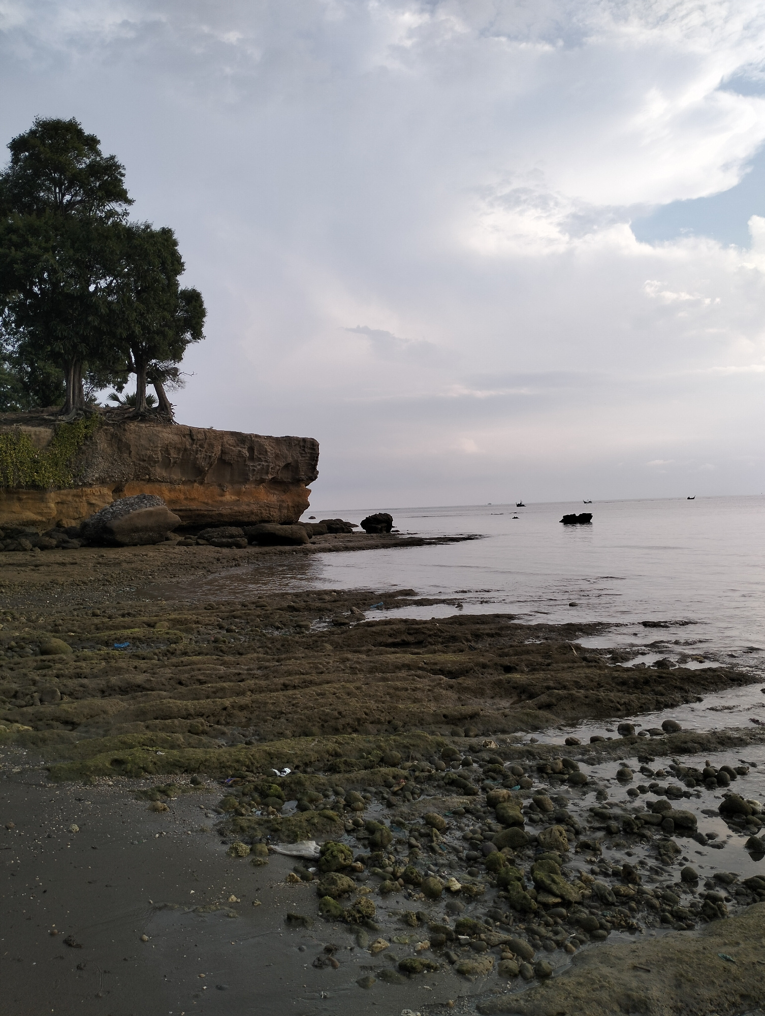 The image shows a coastal scene in Lhokmanee, Indonesia. A cliff topped with trees dominates the left side of the frame. The cliff appears to be made of layered rock and soil. The foreground consists…read more