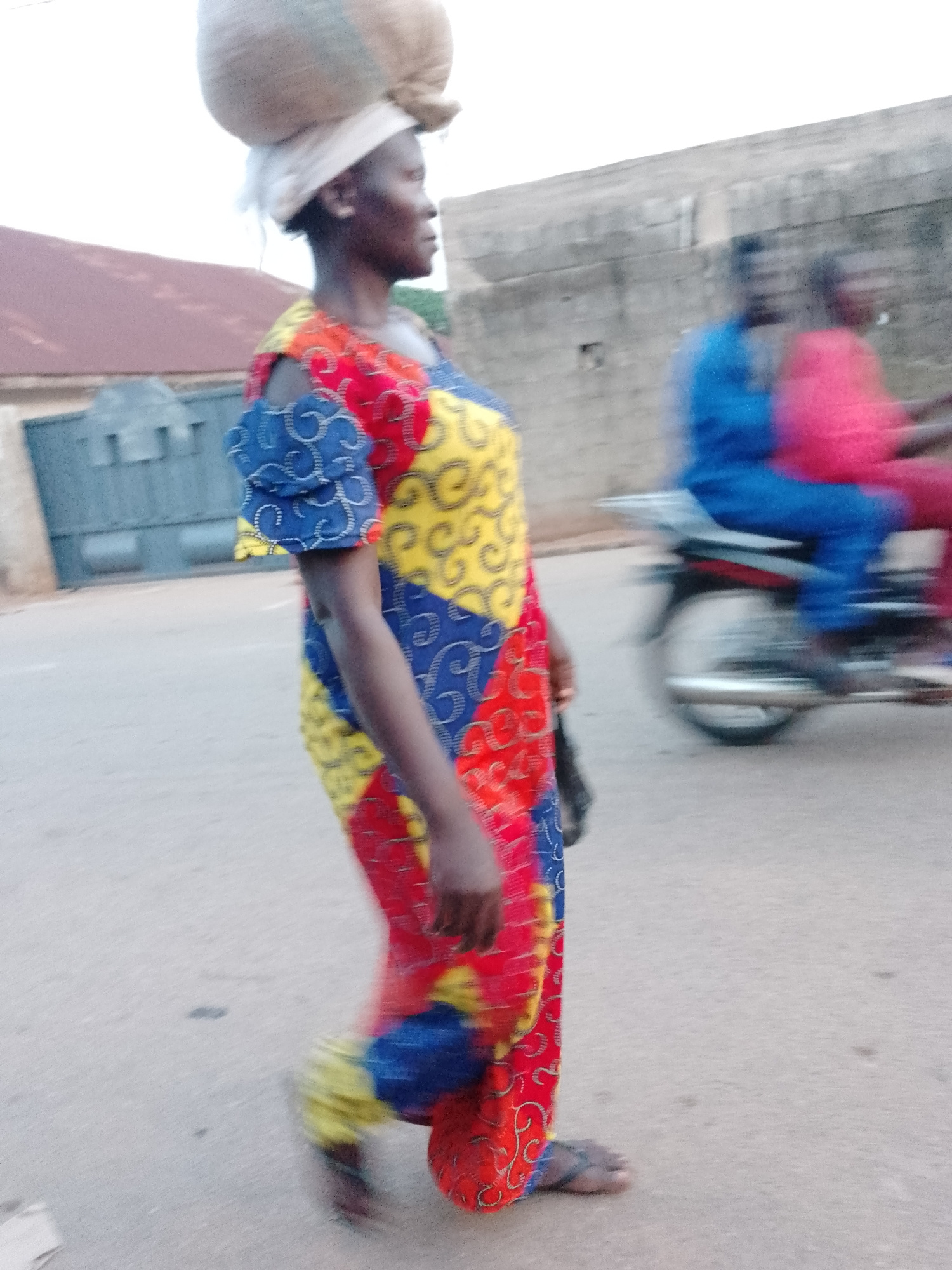 A woman with a sack on her head walks along a street in Akwanga, Nigeria. She wears a brightly colored patchwork dress. In the background, two people ride a motorcycle. Buildings line the street. The…read more