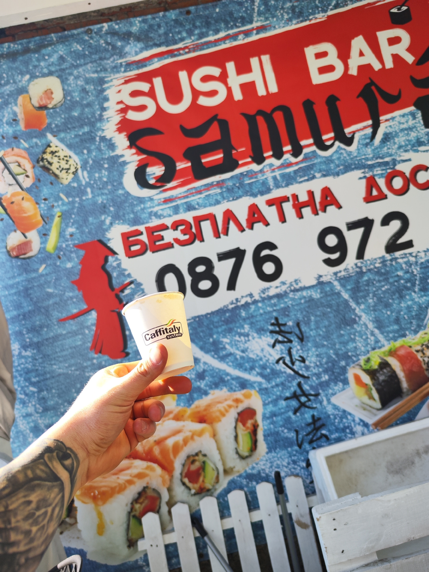 The photograph depicts a hand holding a small white Caffitaly coffee cup in front of a Sushi Bar stand in Burgas, Bulgaria. The stand features a sign with the words "SUSHI BAR" and "Samurai" in bold l…read more