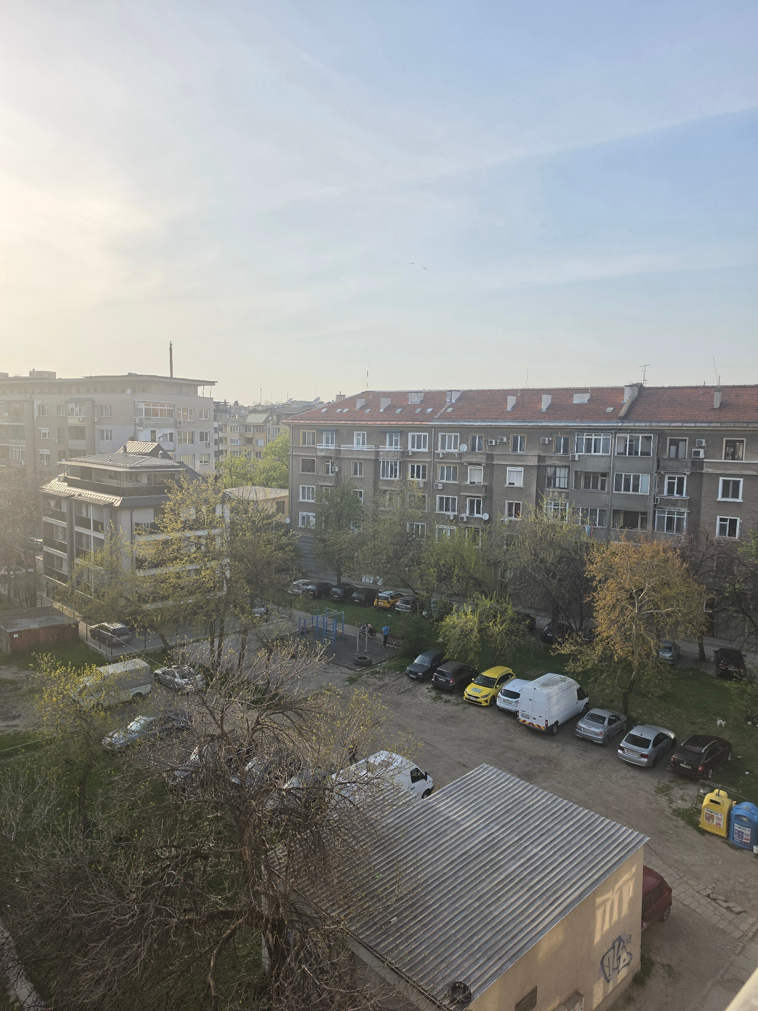 The image shows an aerial view of a residential area in Plovdiv, Bulgaria. Several apartment buildings are visible, with a tall building with a red roof dominating the view. Trees are interspersed bet…read more