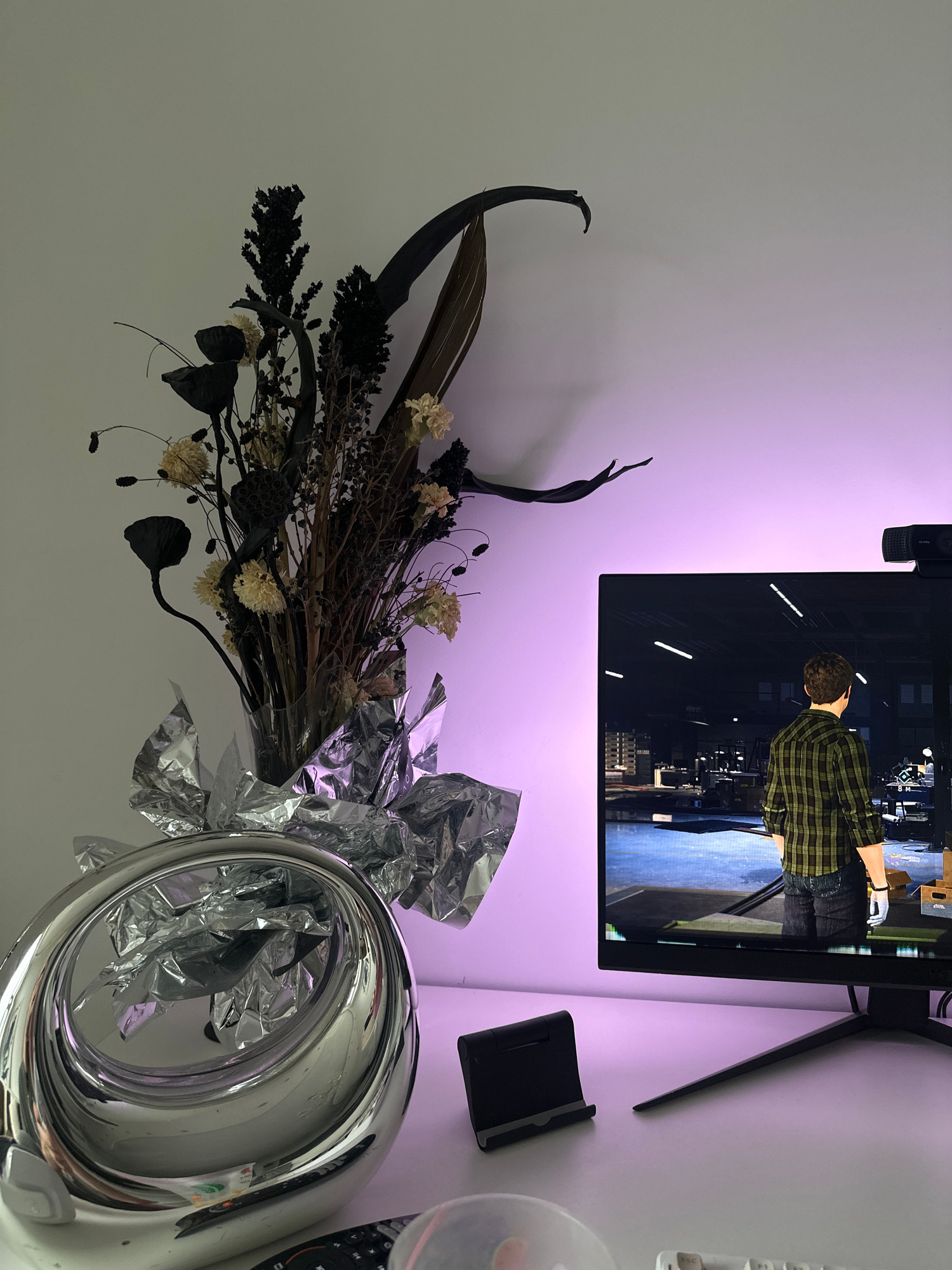 The image depicts a still life arrangement against a white wall illuminated with a purple hue. A black computer monitor is situated at the upper center of the frame, with a man in a green and yellow p…read more