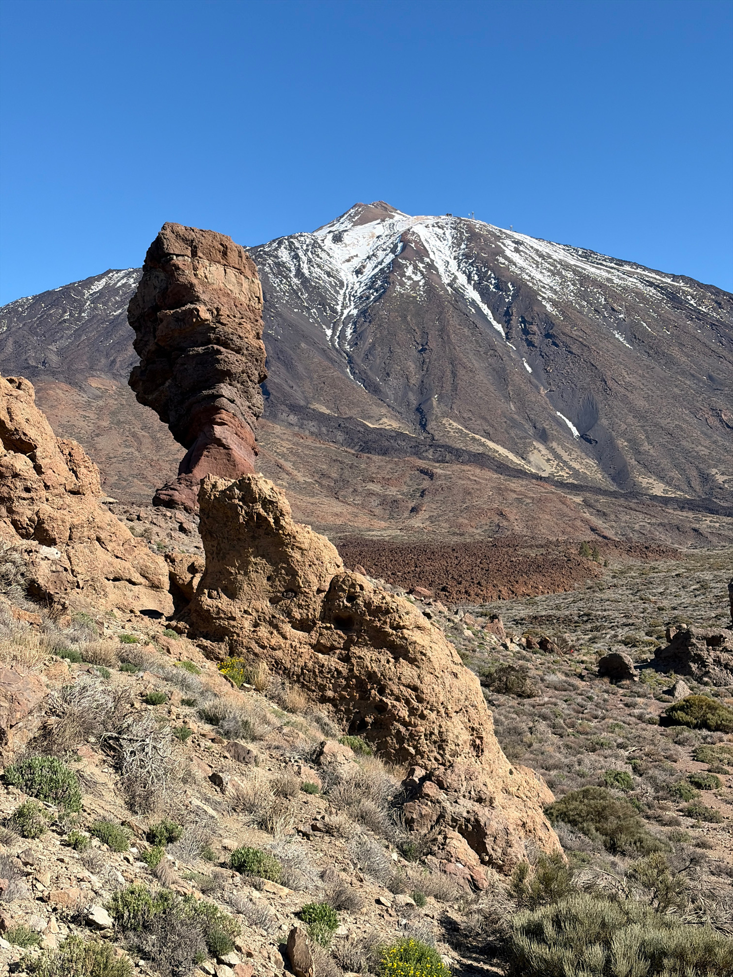 The image shows a rock formation in the foreground, with the snow-capped Mount Teide in the background against a clear blue sky. The rock formation appears as an arch or natural bridge, comprised of b…read more