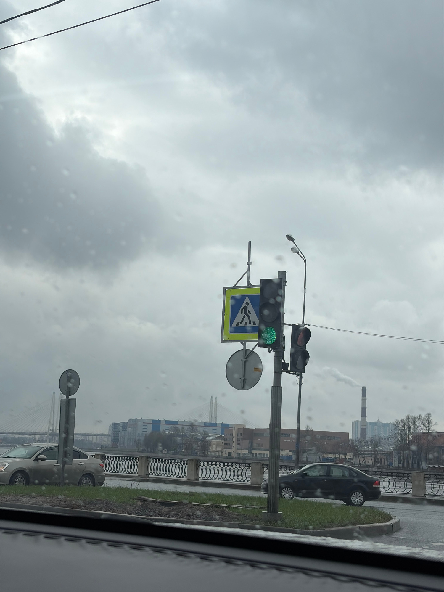 View from inside a vehicle on a gray, overcast day in Saint Petersburg, Russia. A traffic light shows green above a pedestrian crossing sign. Beyond the traffic light, a black car is parked on the graβ¦read more