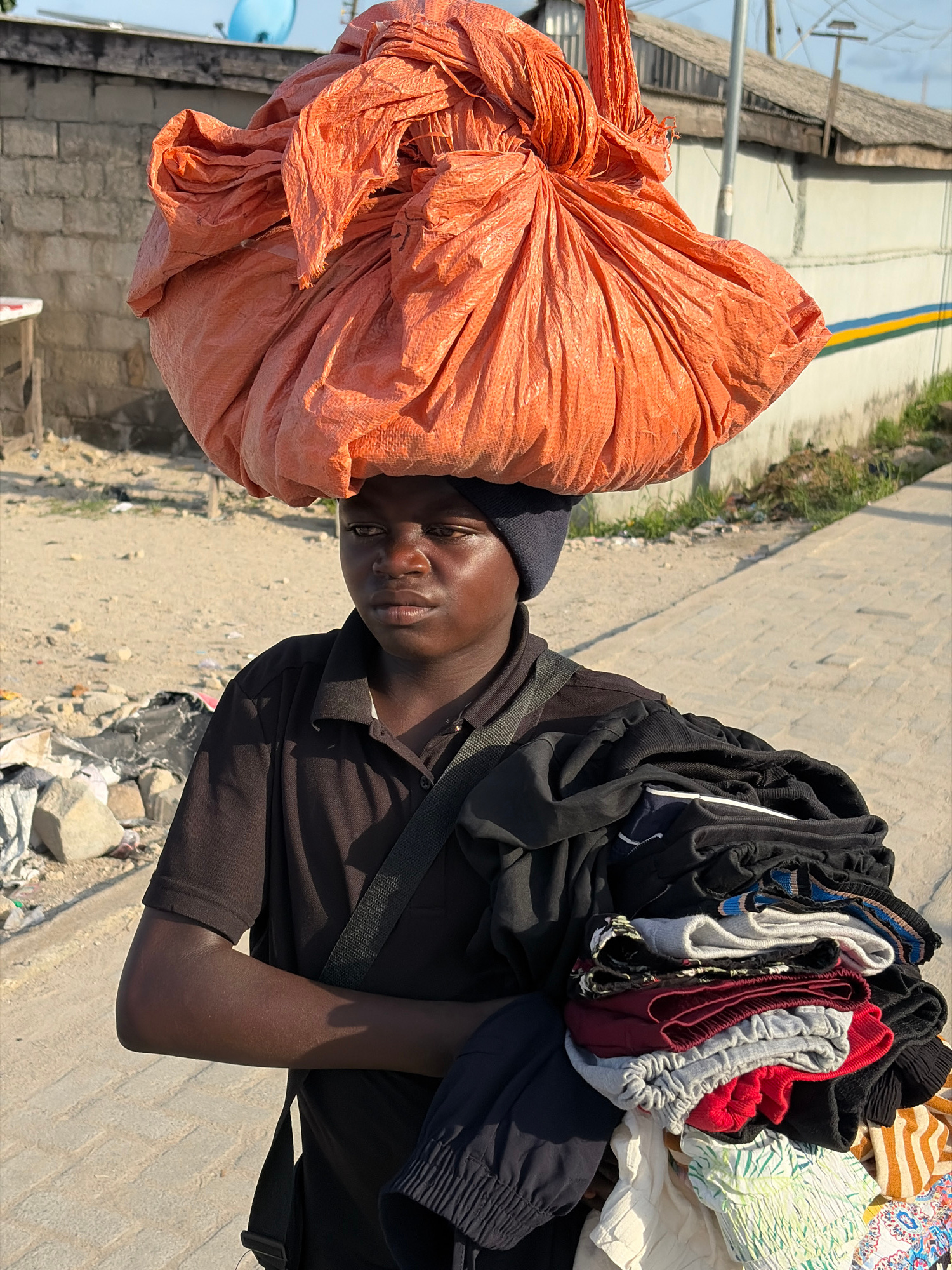The image shows a man in Igboefon, Nigeria carrying two large bundles. A large orange bag is balanced on his head. He also carries a pile of clothes and other items on his shoulder. He wears a dark be…read more