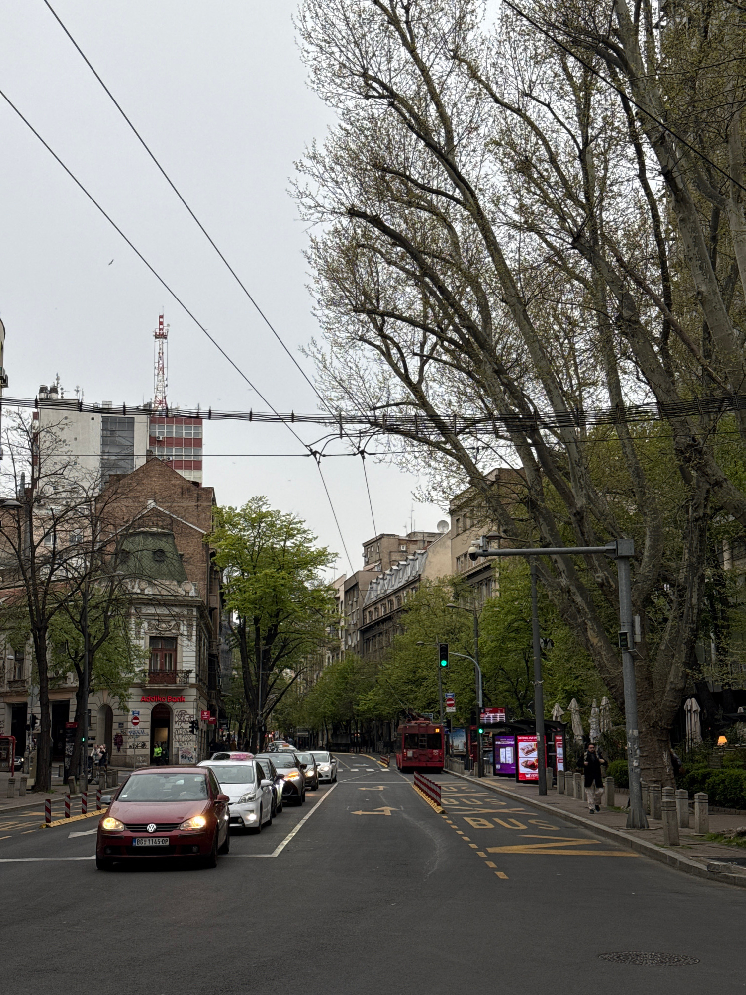 A street scene in Belgrade, Serbia, features a tree-lined avenue with buildings lining both sides. A red bus occupies a designated bus lane on the right, marked with yellow painted letters. A line of…read more
