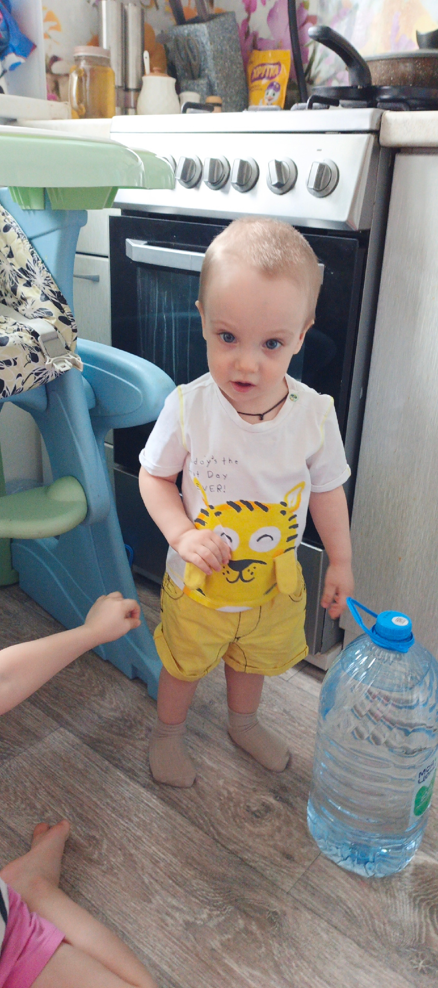 A young child stands in a kitchen setting. The child is fair-skinned, with a light blonde buzz cut and blue eyes, wearing a white t-shirt featuring a cartoon tiger and yellow shorts with khaki socks.…read more