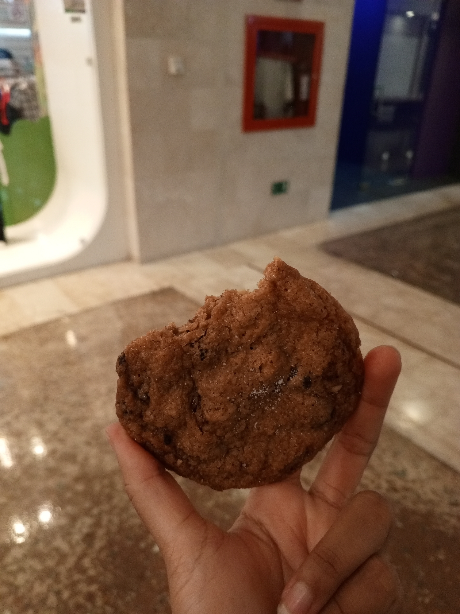 A partially-eaten chocolate chip cookie is held up in a person's hand. The background shows a blurred indoor location with beige marble flooring and a decorative wall with an orange-framed rectangular…read more
