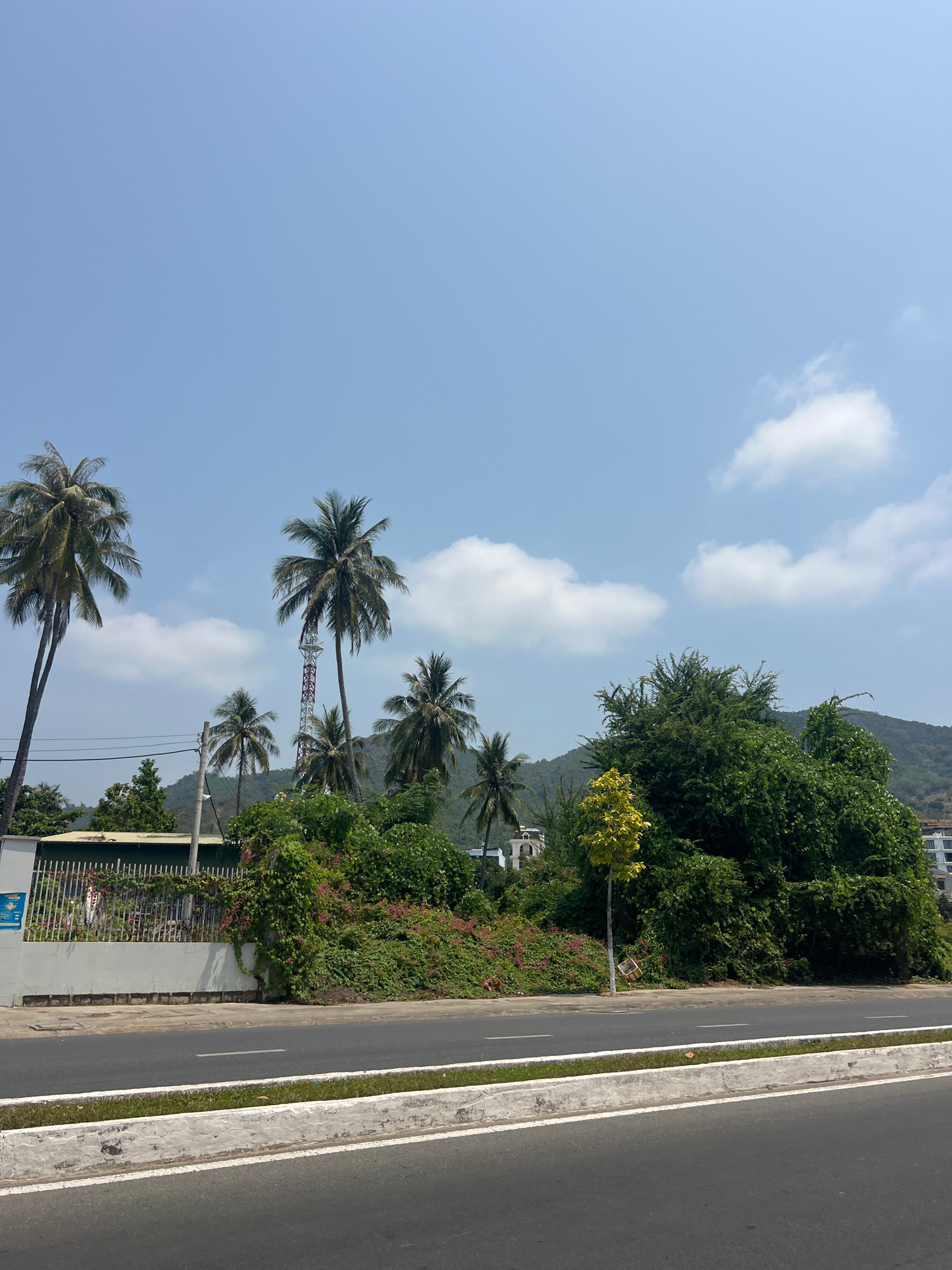 A daytime scene in Bắc Nha Trang, Vietnam, features a view with a focus on the environment and infrastructure. A road with white painted curbs runs along the right edge. Lush green foliage lines the r…read more
