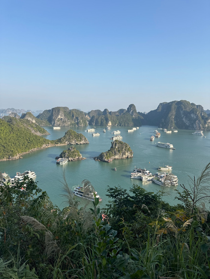 An elevated panoramic view captures Ha Long Bay in Ha Long Ward, Vietnam, under a clear blue sky. The scene is dominated by numerous, heavily vegetated limestone karst islands and islets emerging from…read more