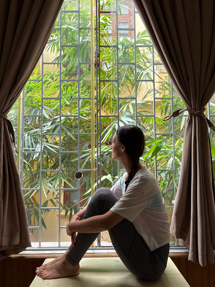 An adult female, positioned in profile facing right, is seated barefoot on a light-colored surface, possibly a window sill or low bench, within an interior space. She wears a white short-sleeved t-shirt with subtle pastel markings and dark gray patterned leggings. Her dark hair is styled in a braid. Her gaze is directed outwards through a large window, framed on either side by tied-back brown curtains. The window is secured by a prominent gray metal grid of rectangular bars. Beyond the window and security bars, dense green foliage, consistent with bamboo, is visible, partially obscuring a light-yellow building with dark-framed windows in the background. The environment, characterized by dense urban greenery and visible architecture, is consistent with a residential or guesthouse courtyard common in the city of Hà Nội, Vietnam. | Open Wire