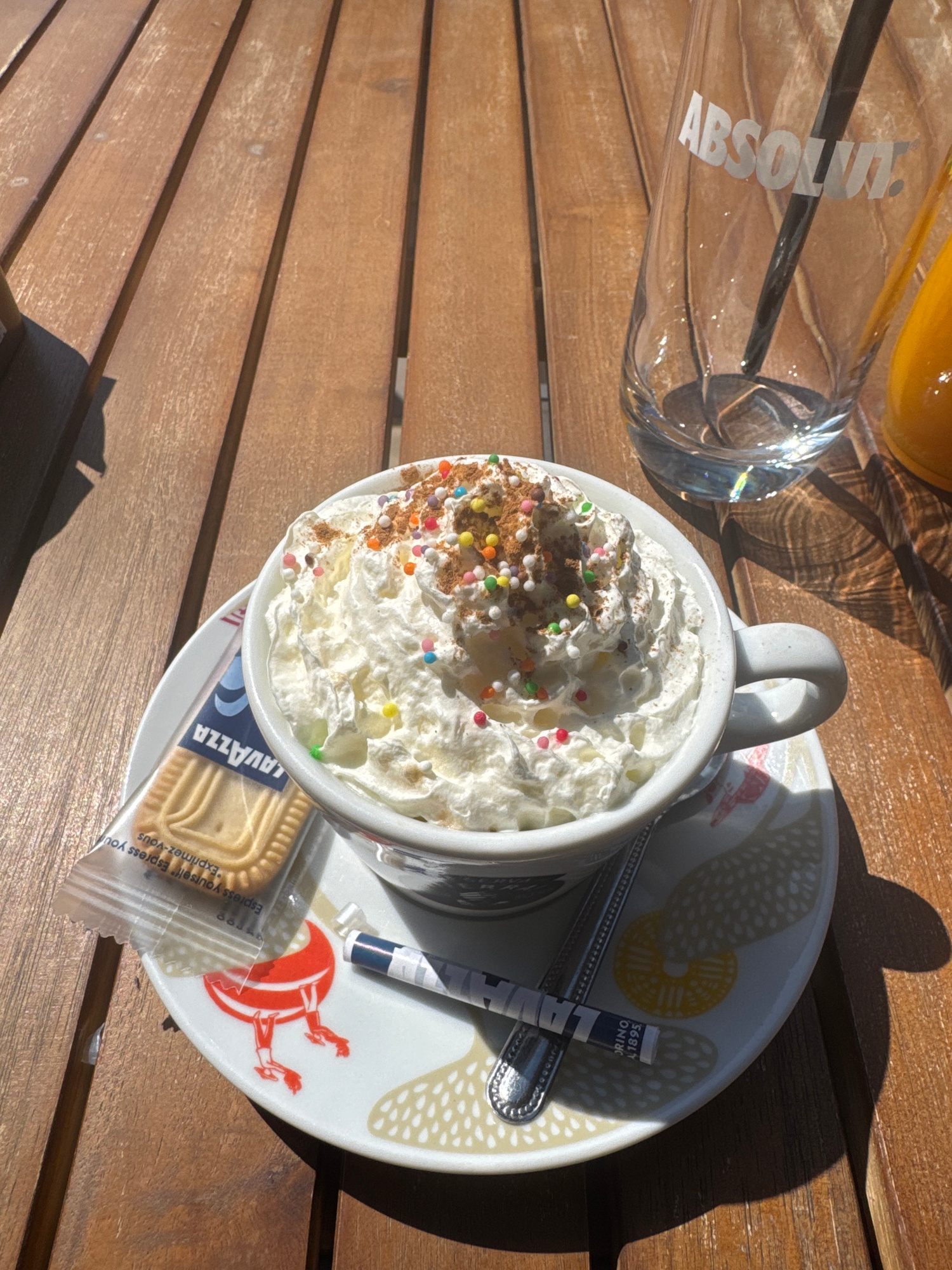 A cup of coffee topped with whipped cream and sprinkles sits on a saucer next to a glass of orange juice on a wooden table. A packet of Lavazza biscuit, a sugar packet, and a spoon are on the saucer a…read more
