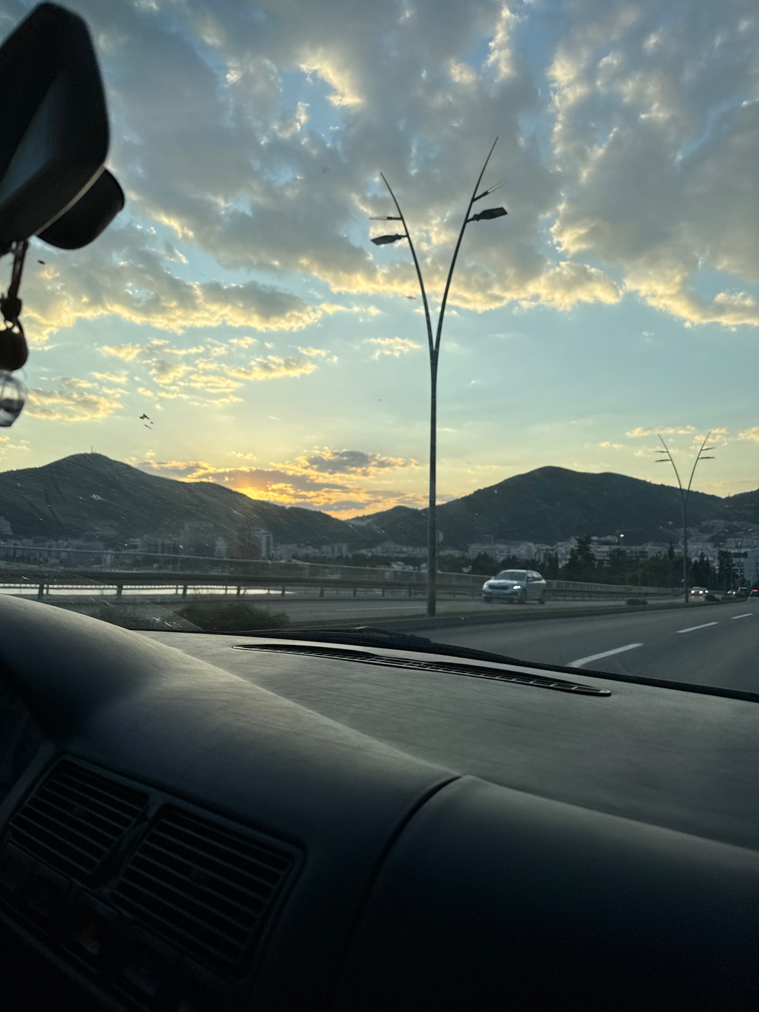 The image shows a view from inside a car, looking out onto a highway in Budva, Montenegro. The sky is filled with light blue and gold-tinged clouds, suggesting either sunrise or sunset. In the middle…read more
