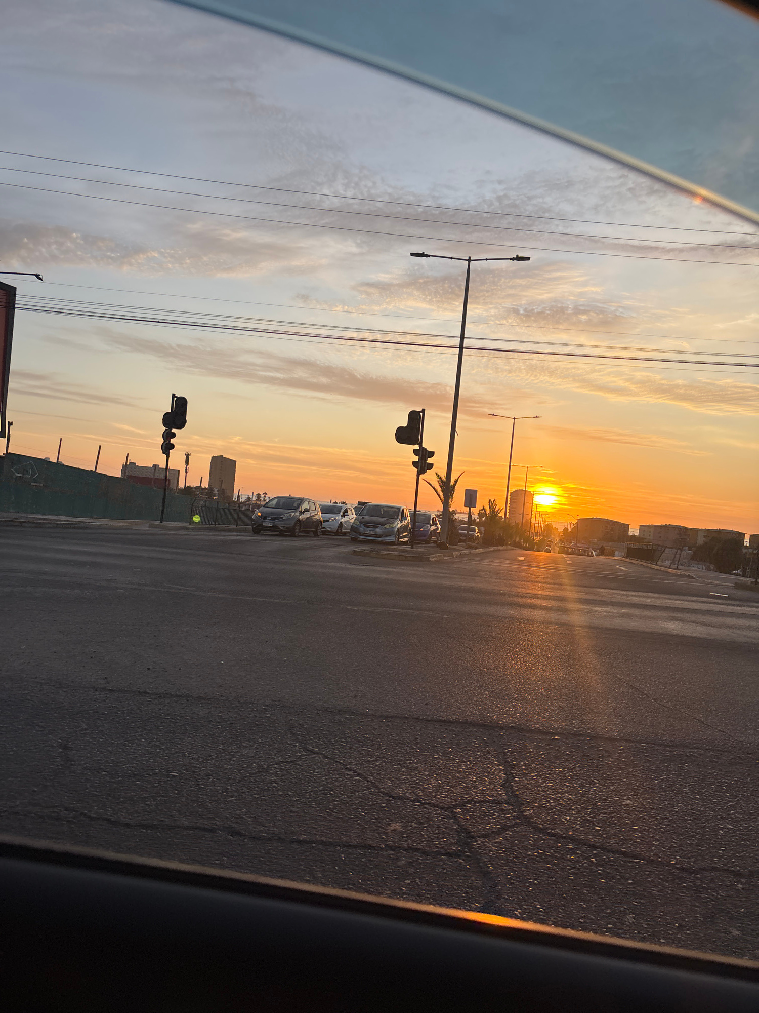The image captures a sunset scene from inside a vehicle in Arica, Chile. The sun is setting directly ahead, casting a bright orange glow across the sky and reflecting off the asphalt road. Several par…read more