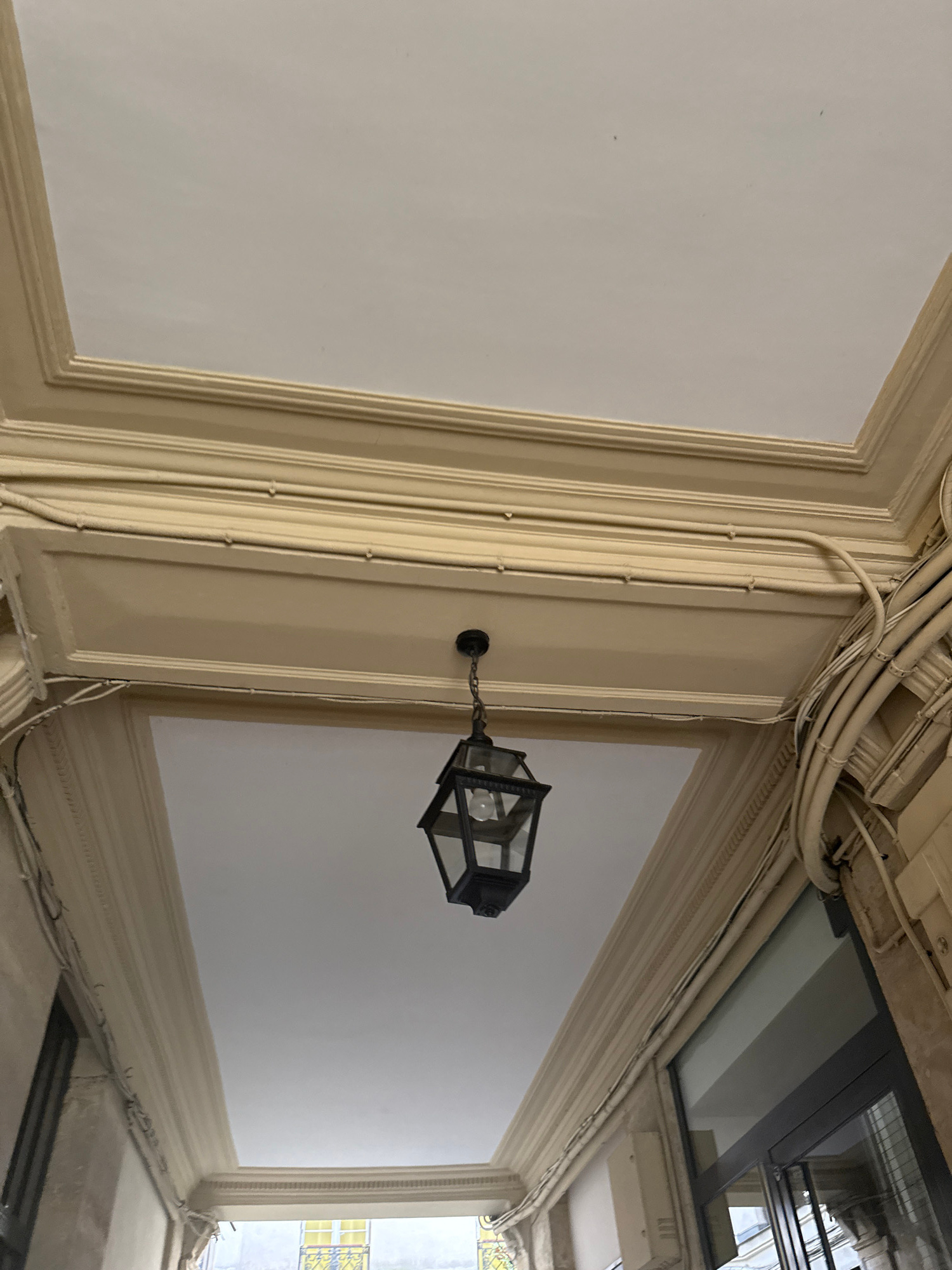 The image depicts an architectural detail inside a building, likely in Paris, France, based on the classic Parisian design elements. The perspective is looking upwards, showing a section of the wall a…read more