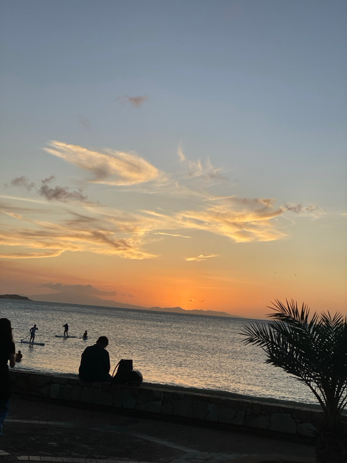 The image depicts a coastal scene at sunset in Juan Griego, Venezuela. The sky transitions from a pale blue at the top to vibrant orange and yellow hues near the horizon, with scattered clouds illumin…read more