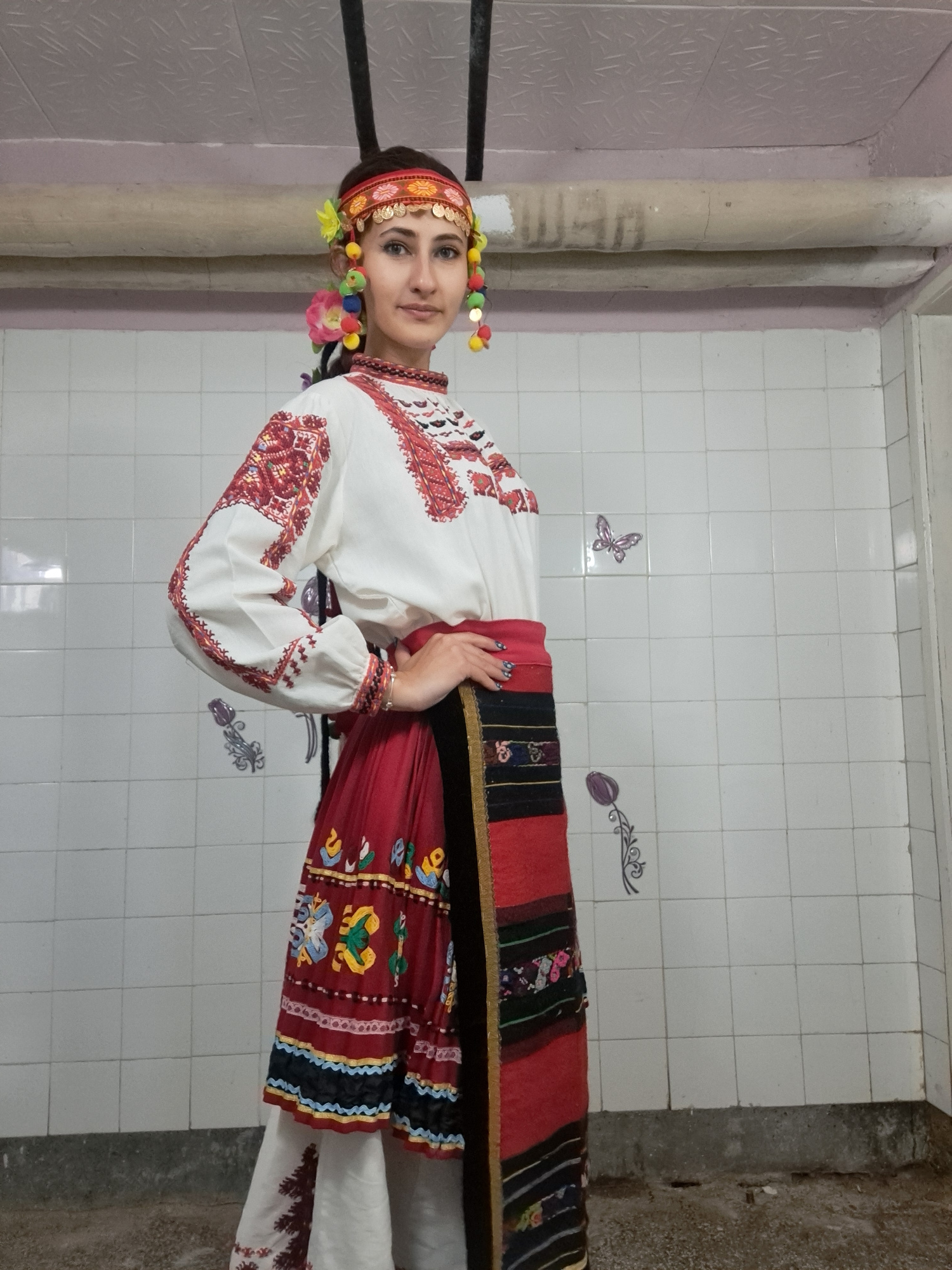 The image shows a young woman dressed in a traditional Bulgarian folk costume. She has a colorful headband decorated with flowers and pom-poms. Her blouse is white with red embroidery on the sleeves a…read more