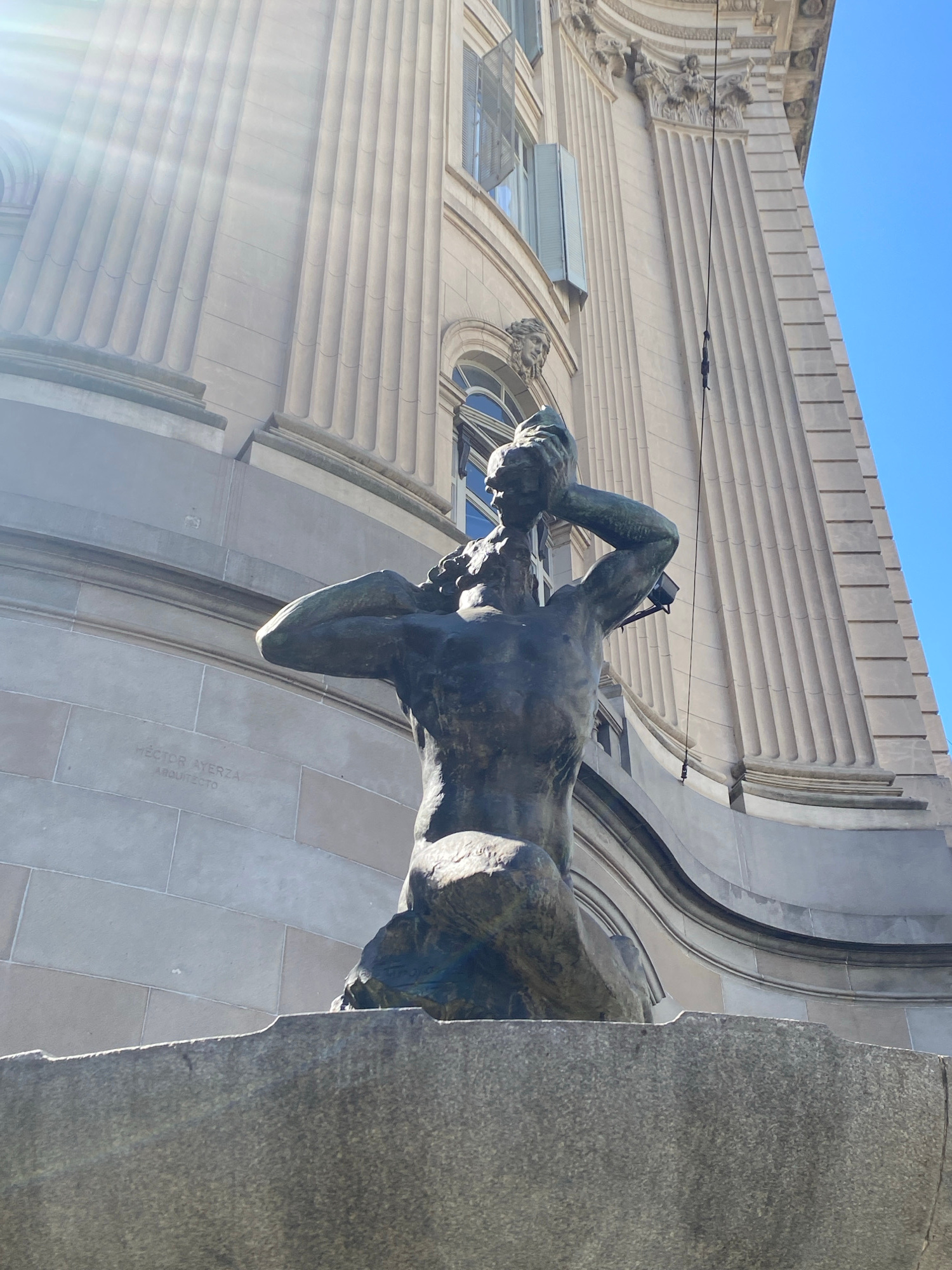 The image shows a bronze sculpture of a man, seemingly deep in thought, set against the backdrop of a building facade in Buenos Aires, Argentina. The building features Art Deco architectural details w…read more