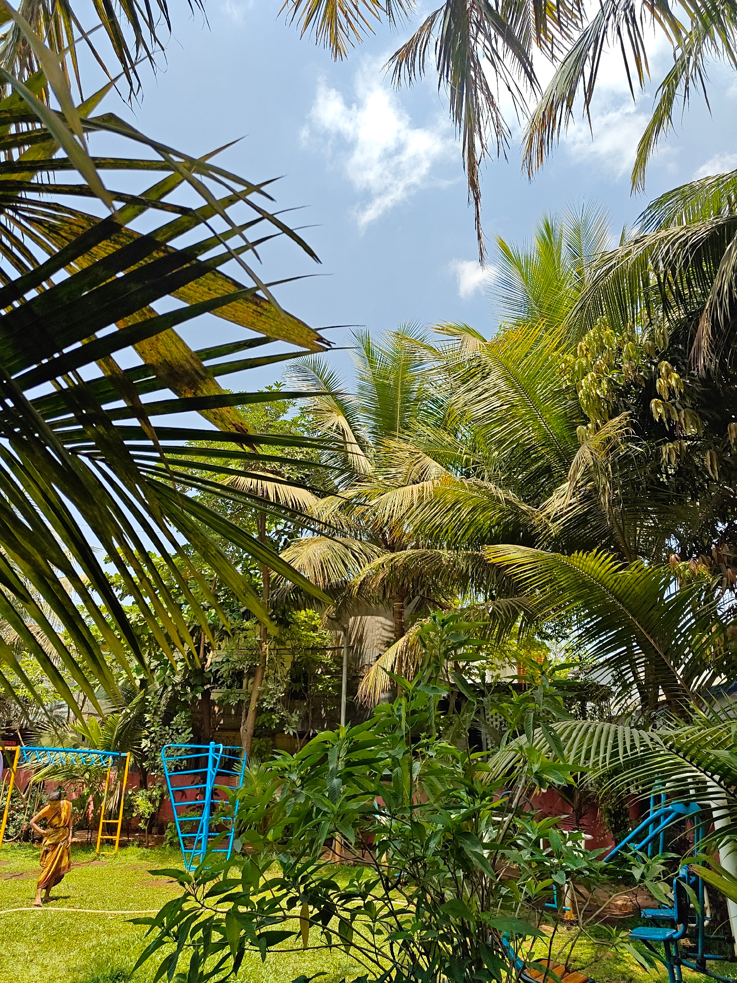 The image captures a scene within a lush, overgrown garden, likely in a tropical or subtropical location. The foreground is dominated by vibrant green foliage of various plants and trees, including pa…read more