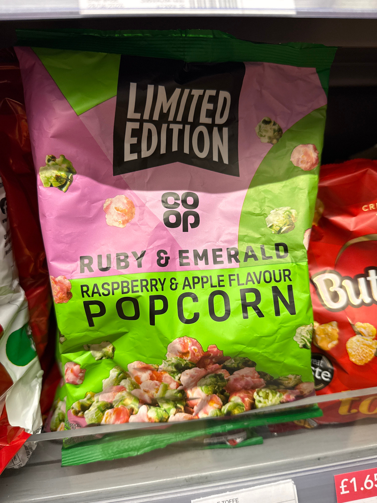 The image shows a package of Co-op Limited Edition Ruby & Emerald Raspberry & Apple Flavour Popcorn, positioned in what appears to be a refrigerated shelf or display case. Other food packages are part…read more