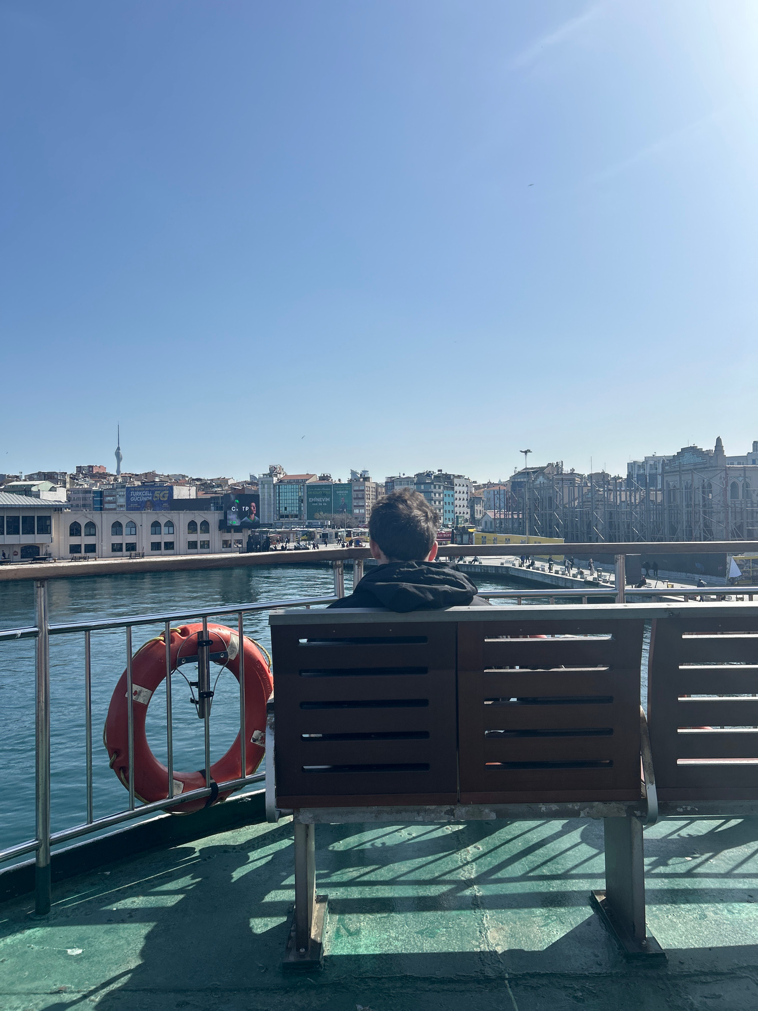 A medium shot of a ferry crossing water in Kadıköy, Turkey. The scene features a person standing by a wooden bench on the boat's edge, with an orange life preserver visible. The ferry overlooks a city…read more