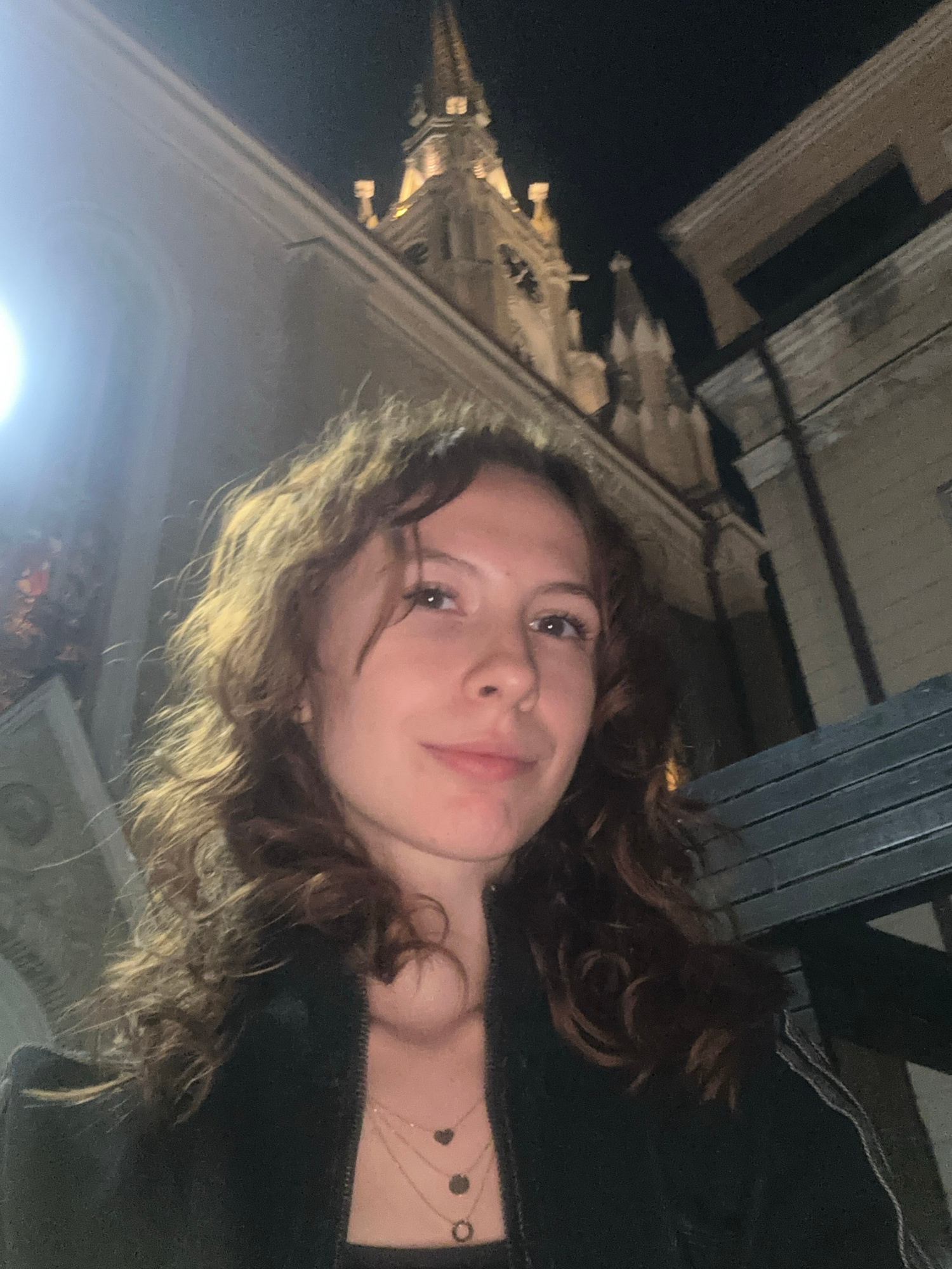 A selfie taken at night, featuring a young woman with light brown hair and fair skin. She is wearing a dark jacket and several necklaces. In the background, a building with a lit clock tower can be se…read more