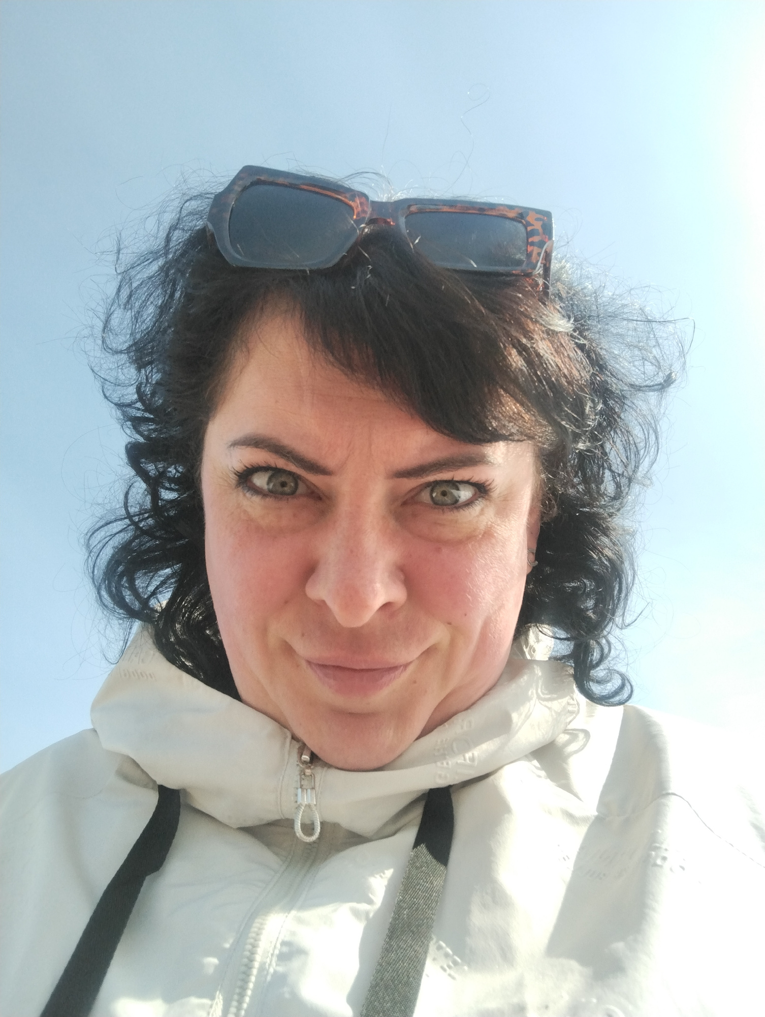 A head-and-shoulders selfie of a woman with dark, curly hair and bangs. Sunglasses are perched on top of her head. She has fair skin, green eyes, and a neutral expression. She is wearing a white hoodeβ¦read more