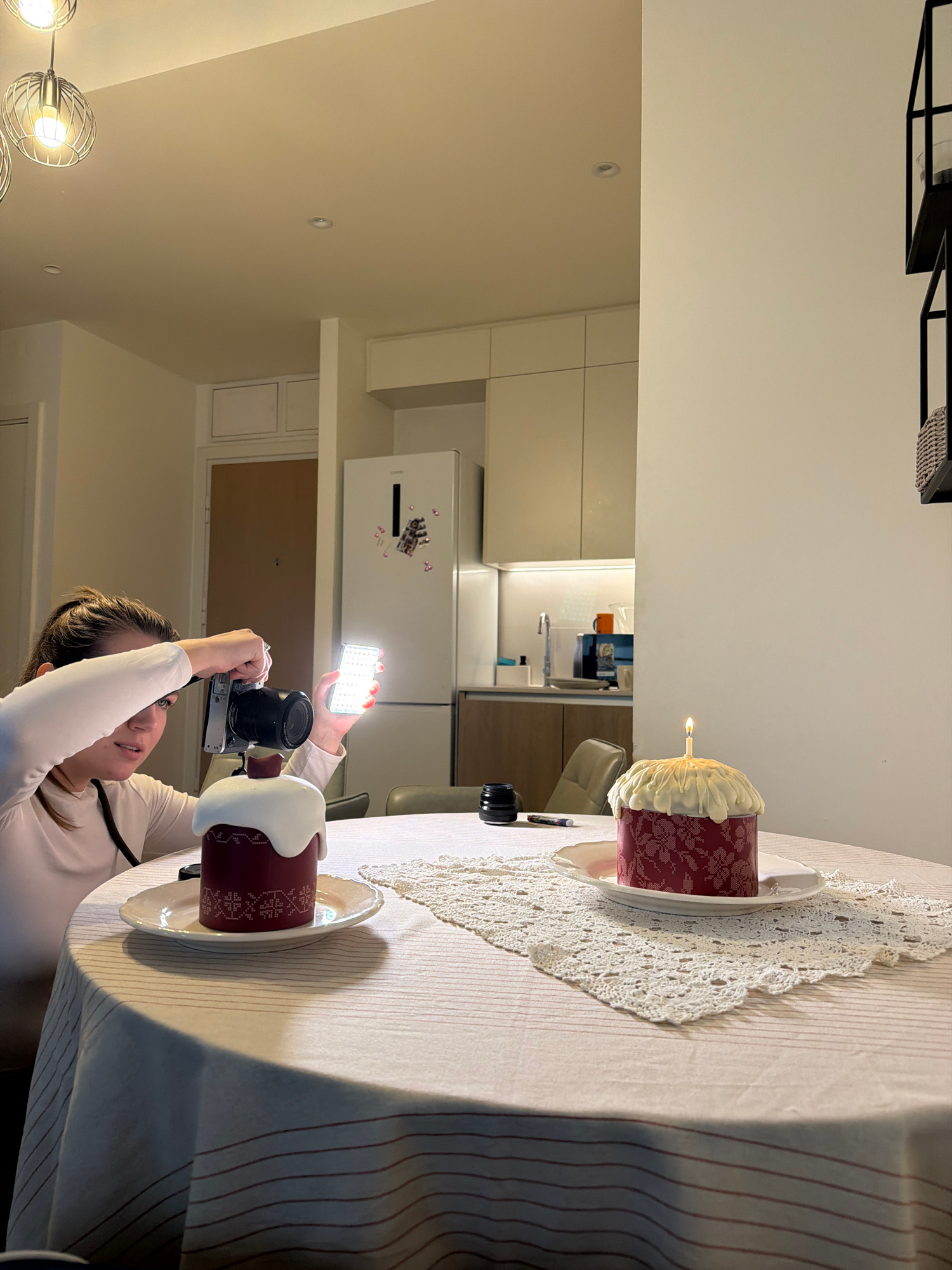 An indoor scene depicts a person photographing two cakes on a round table, situated within a modern apartment in what is identifiable as Belgrade, Serbia, given the Gorenje refrigerator and the traditβ¦read more