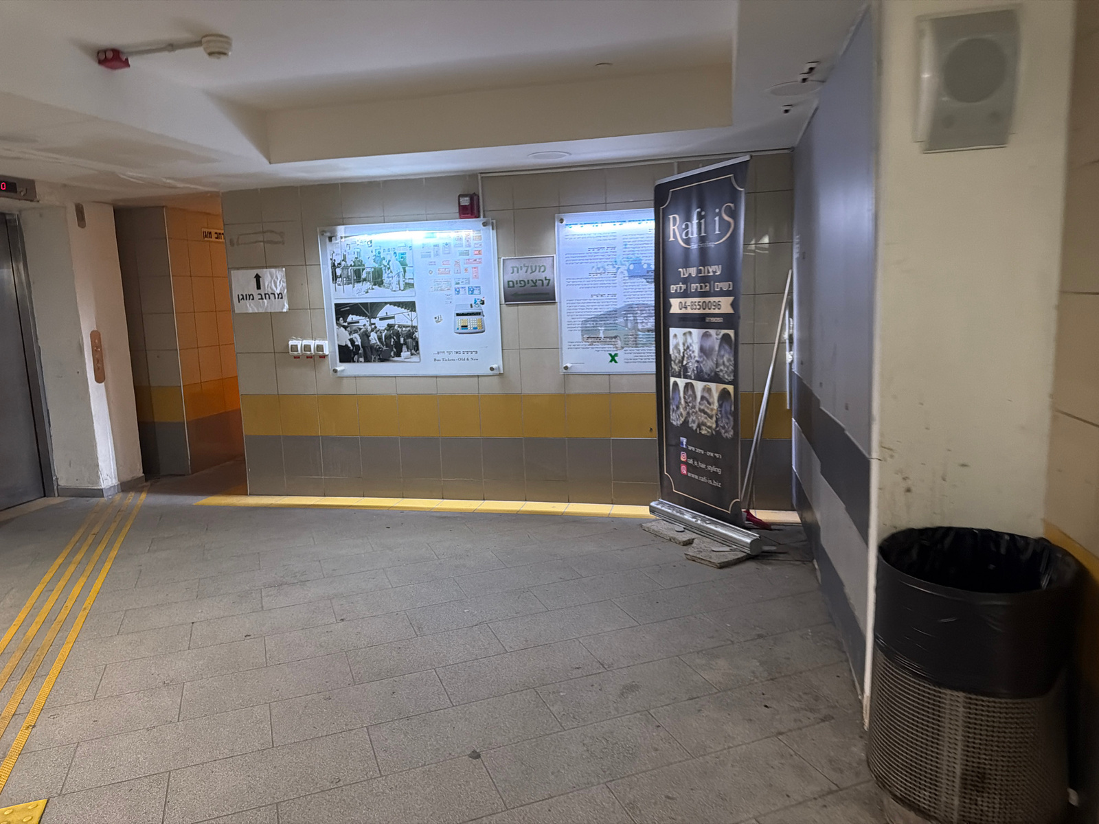 The image depicts an indoor scene in what appears to be a public space, possibly a transit station or a similar communal area. The ground is tiled with rectangular gray stones, and there are yellow ta…read more
