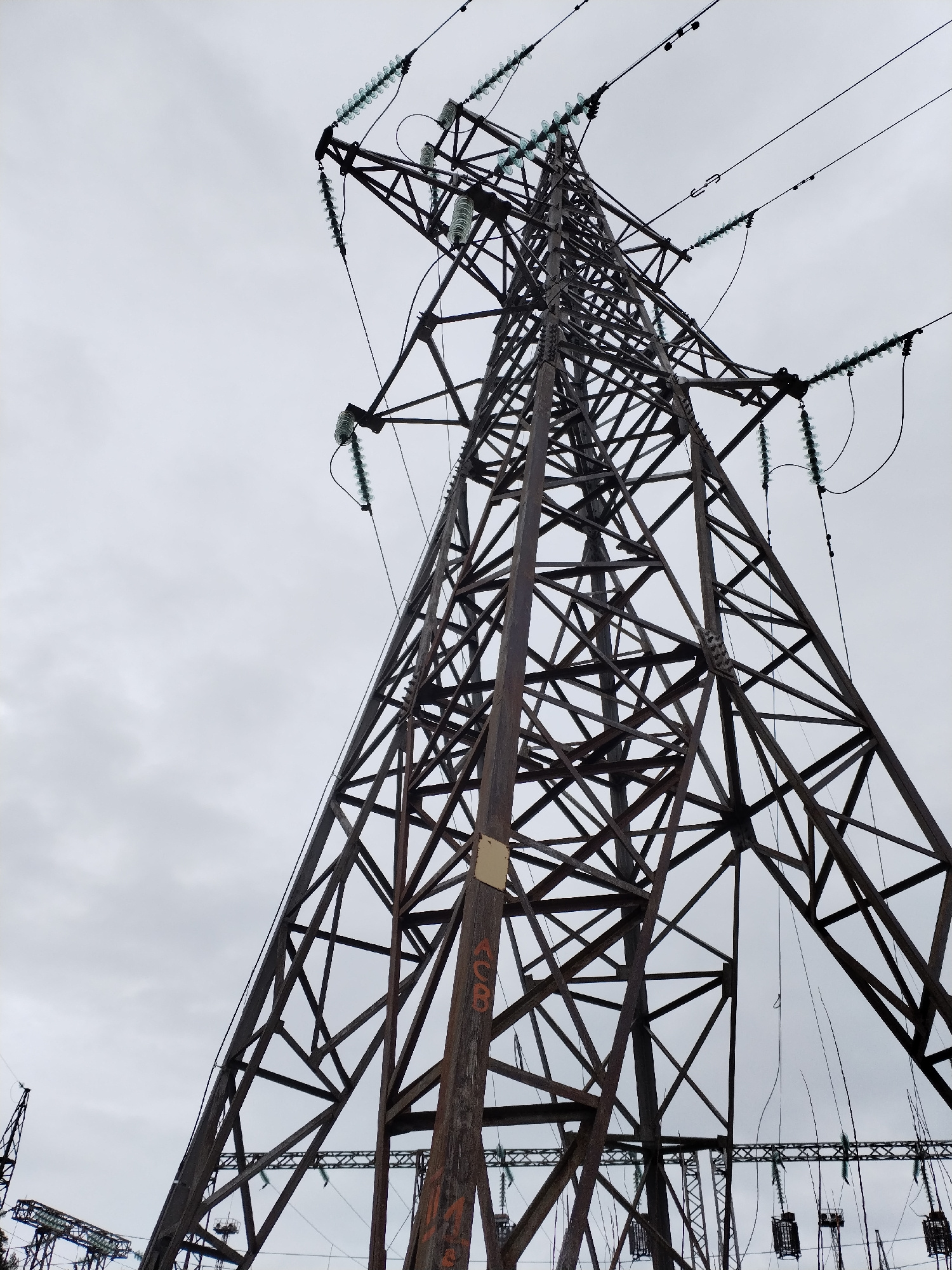 The image shows a steel lattice electricity pylon in Noviy, Russia, viewed from a low angle. The sky is overcast. The pylon structure is made of riveted steel beams forming triangular patterns. Electr…read more