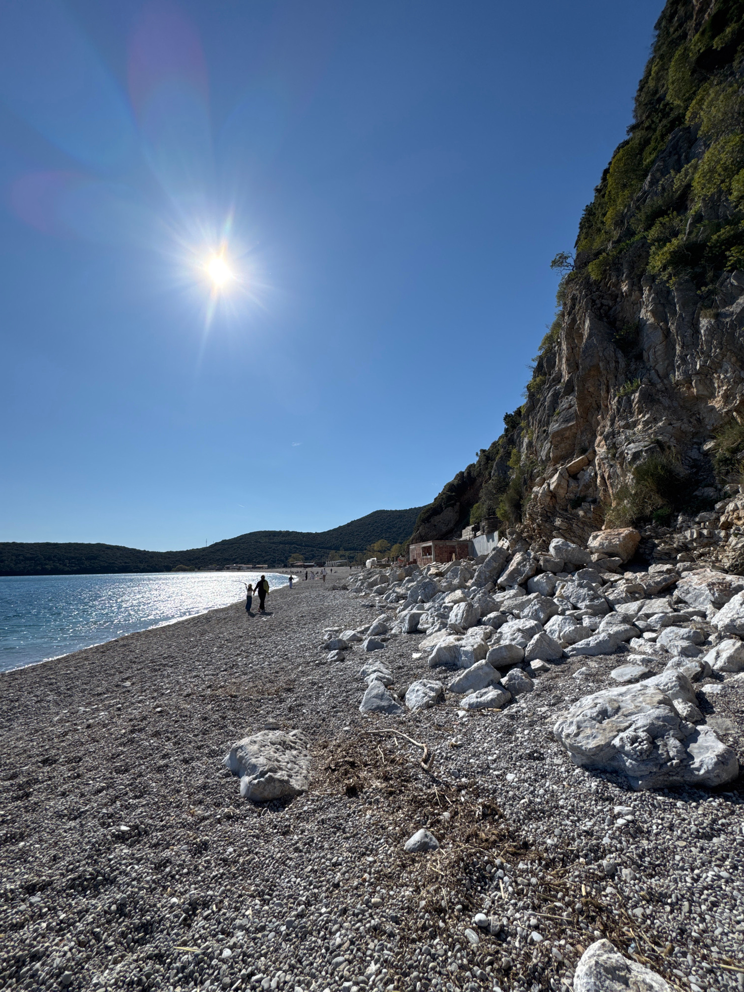 A bright, sunny day illuminates a scene at Prijevor, Montenegro. A long, narrow, pebble beach runs alongside the water's edge. Two people are visible on the beach. A rugged cliff face rises sharply on…read more