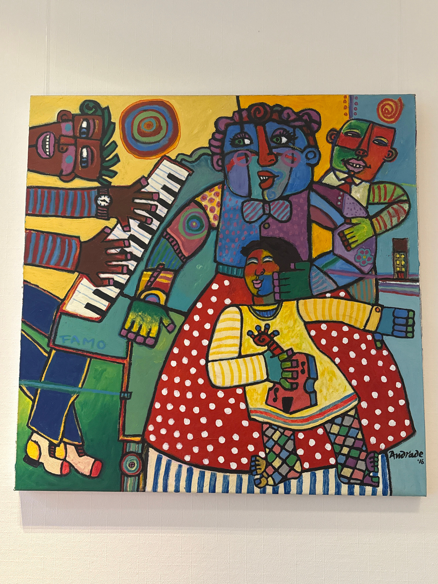 The image is an eye-level studio shot of a square-framed painting hanging on a neutral-colored wall. The painting is a brightly colored, whimsical, abstract representation of people playing music. The…read more