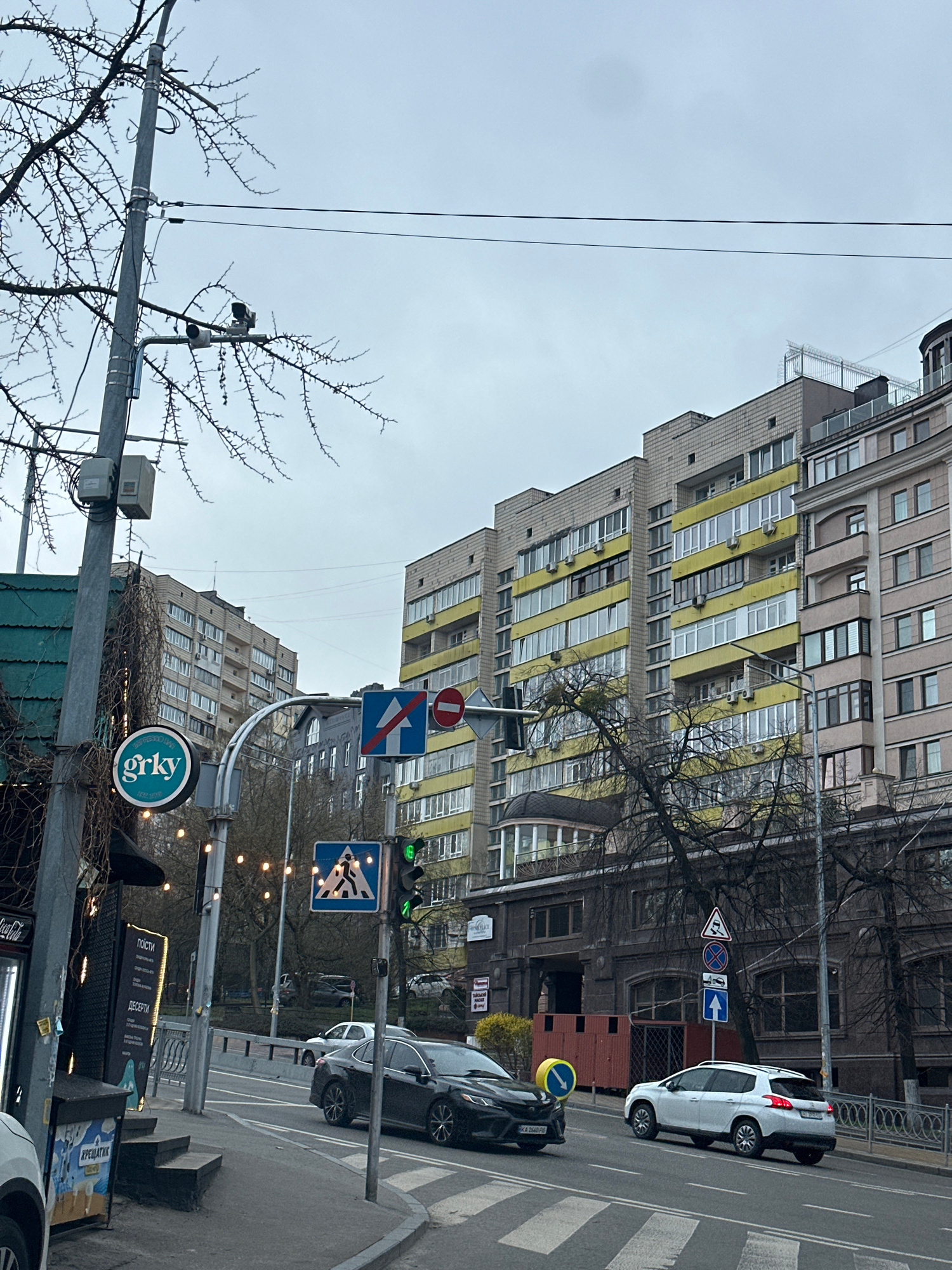 The image depicts a street scene in Kyiv, Ukraine, characterized by overcast weather. A multi-story apartment building with yellow balconies dominates the background. Street furniture includes a streeβ¦read more