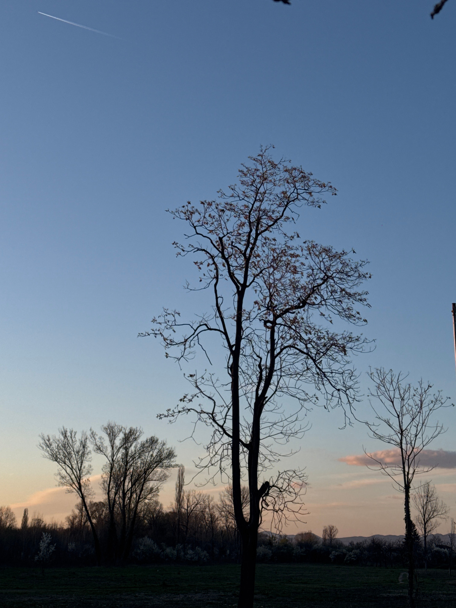 The image shows a landscape with a focus on bare trees against a sky transitioning from blue to shades of pink and orange, indicating either sunrise or sunset. The trees are silhouetted, suggesting th…read more