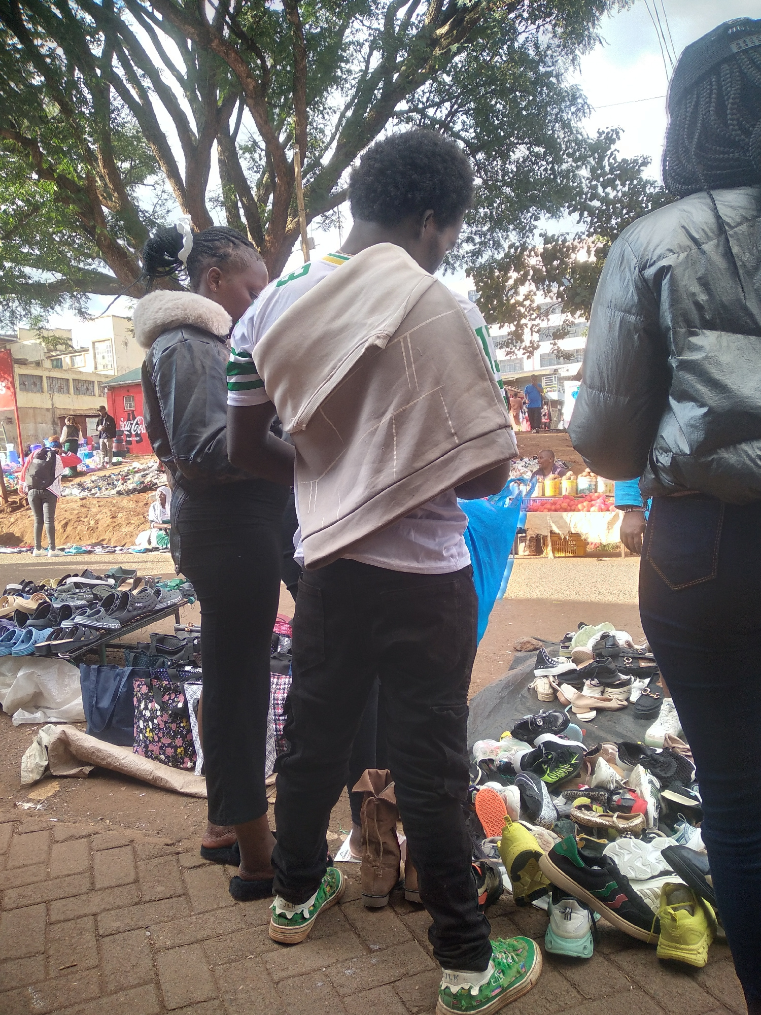 A street market scene in Nyeri, Kenya is captured from a high angle. Vendors display shoes and clothing. Two individuals stand in the foreground, examining the merchandise. The man wears a beige vest.…read more