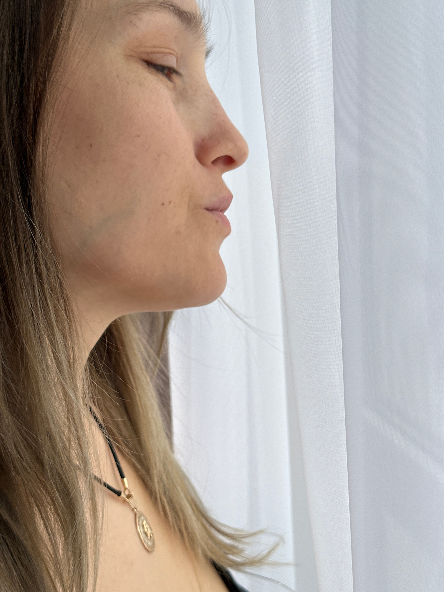 A person is lying down against a white background. The person's head is facing up and to the left, with their eyes closed. Their hair is blonde and partially covers their neck and chest. A necklace wi…read more