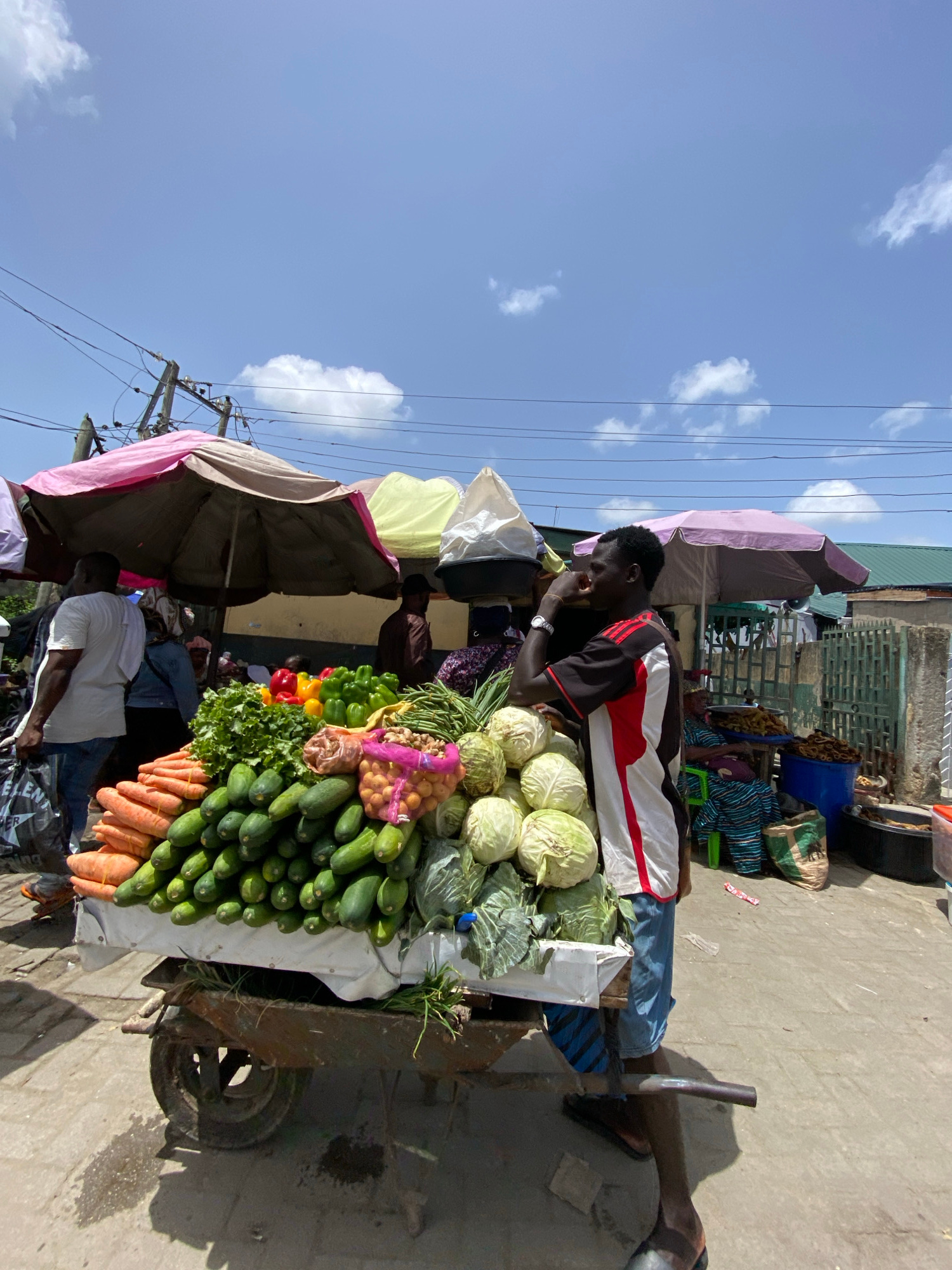 A street vendor stands behind a cart laden with fresh produce in Lekki, Nigeria. The cart displays cabbages, cucumbers, carrots, bell peppers, lettuce, and potatoes. The vendor, a dark-skinned man wea…read more