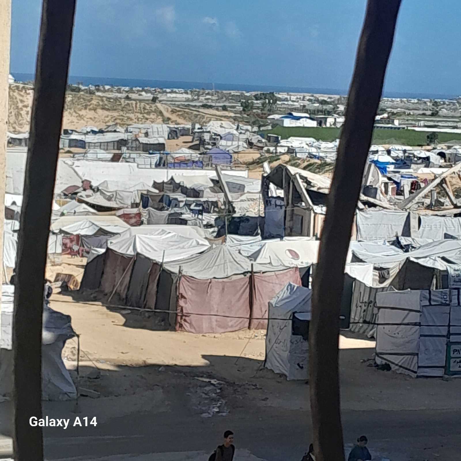 The image depicts a densely populated refugee camp in Khan Yunis, Palestinian Territory. Rows of makeshift tents, constructed from a variety of materials including tarps, cloth, and salvaged wood, dom…read more