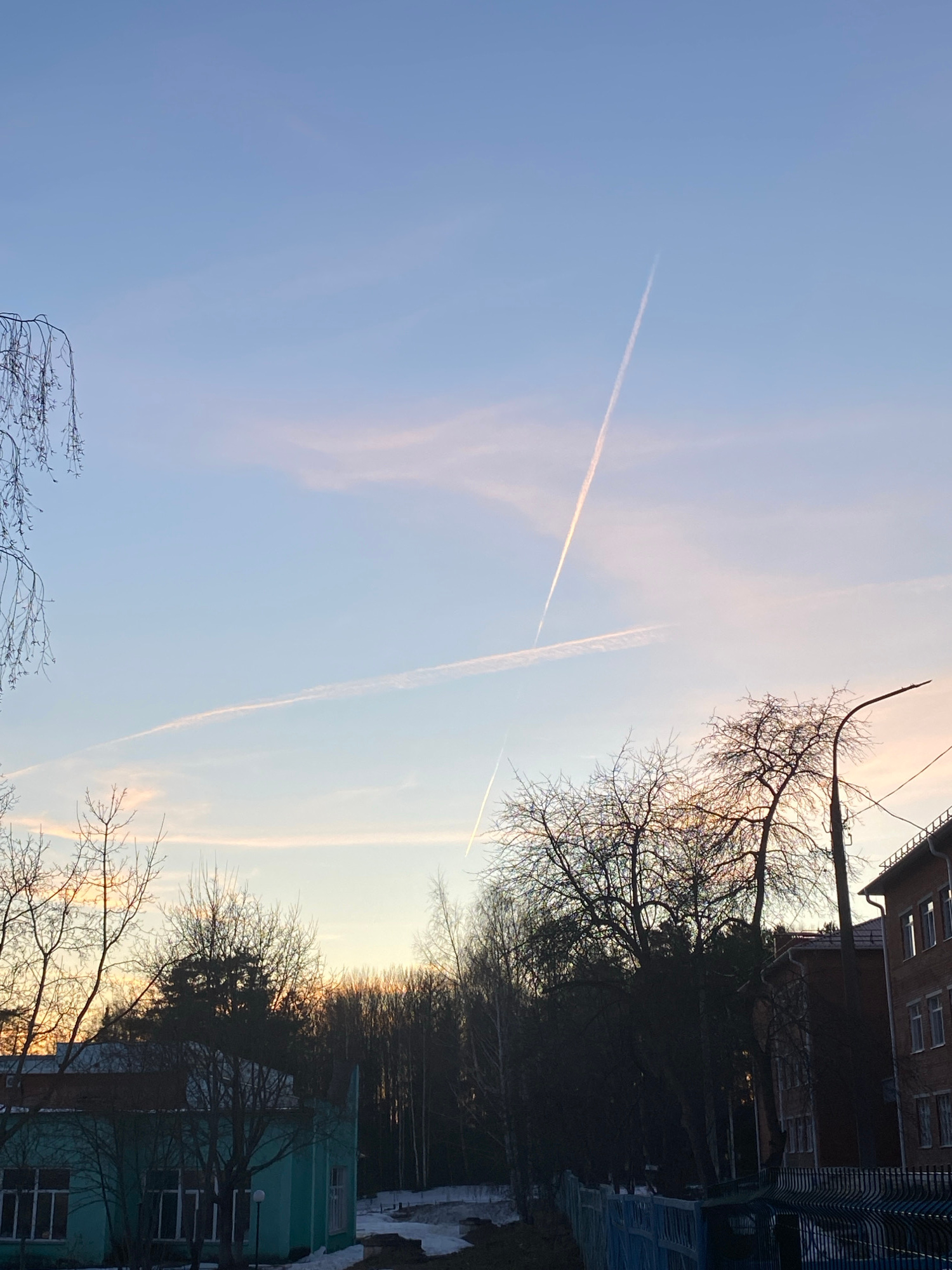 The image captures a sky with two contrails intersecting in the upper-left quadrant. The sky is pale blue, with hints of orange near the horizon. The lower portion of the image shows a landscape featu…read more
