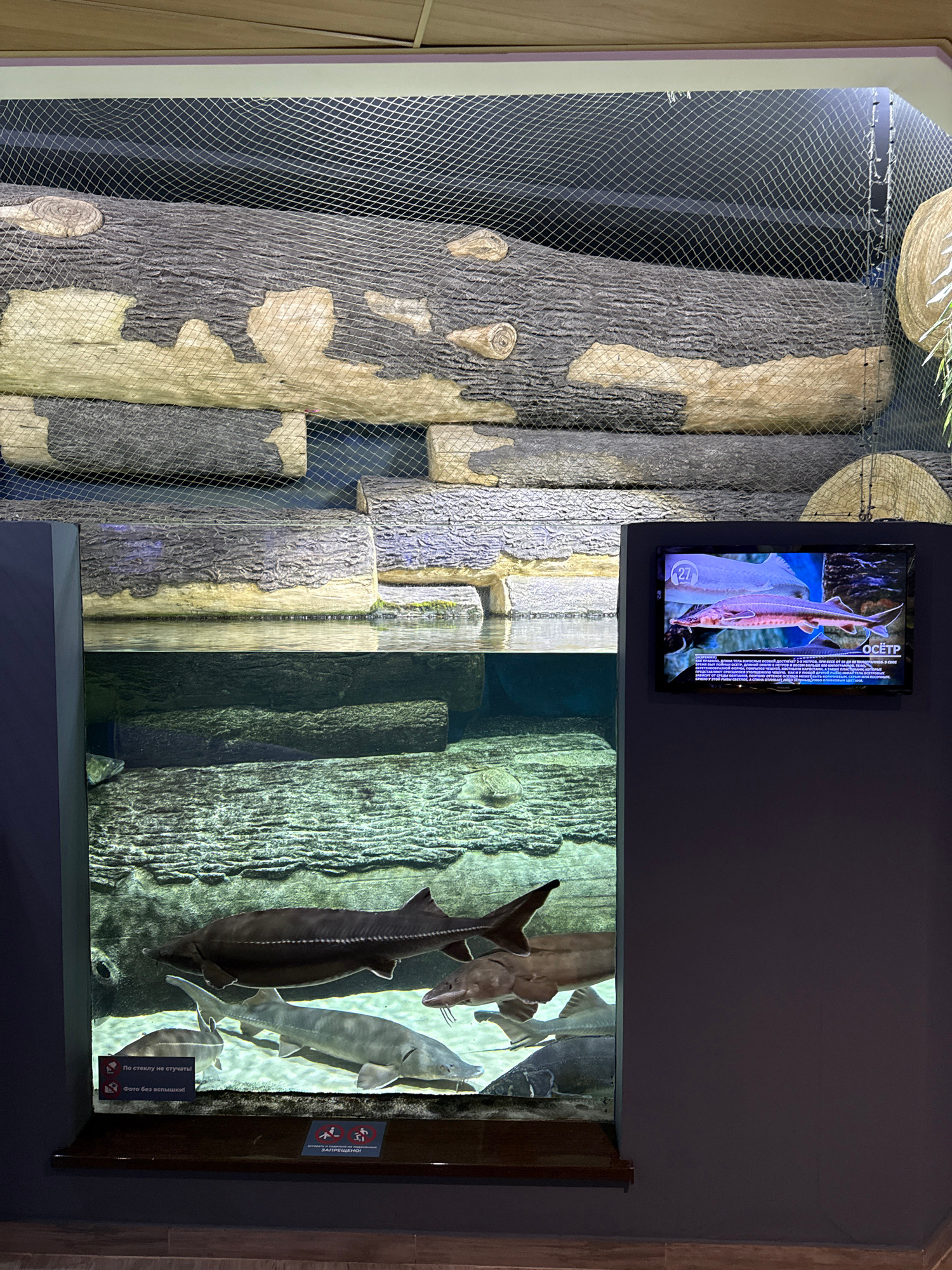 An indoor scene at what appears to be an aquarium or museum exhibit in Kogalym, Russia, showcases a display of sturgeon fish. The image is taken from a slightly elevated perspective, looking into a la…read more
