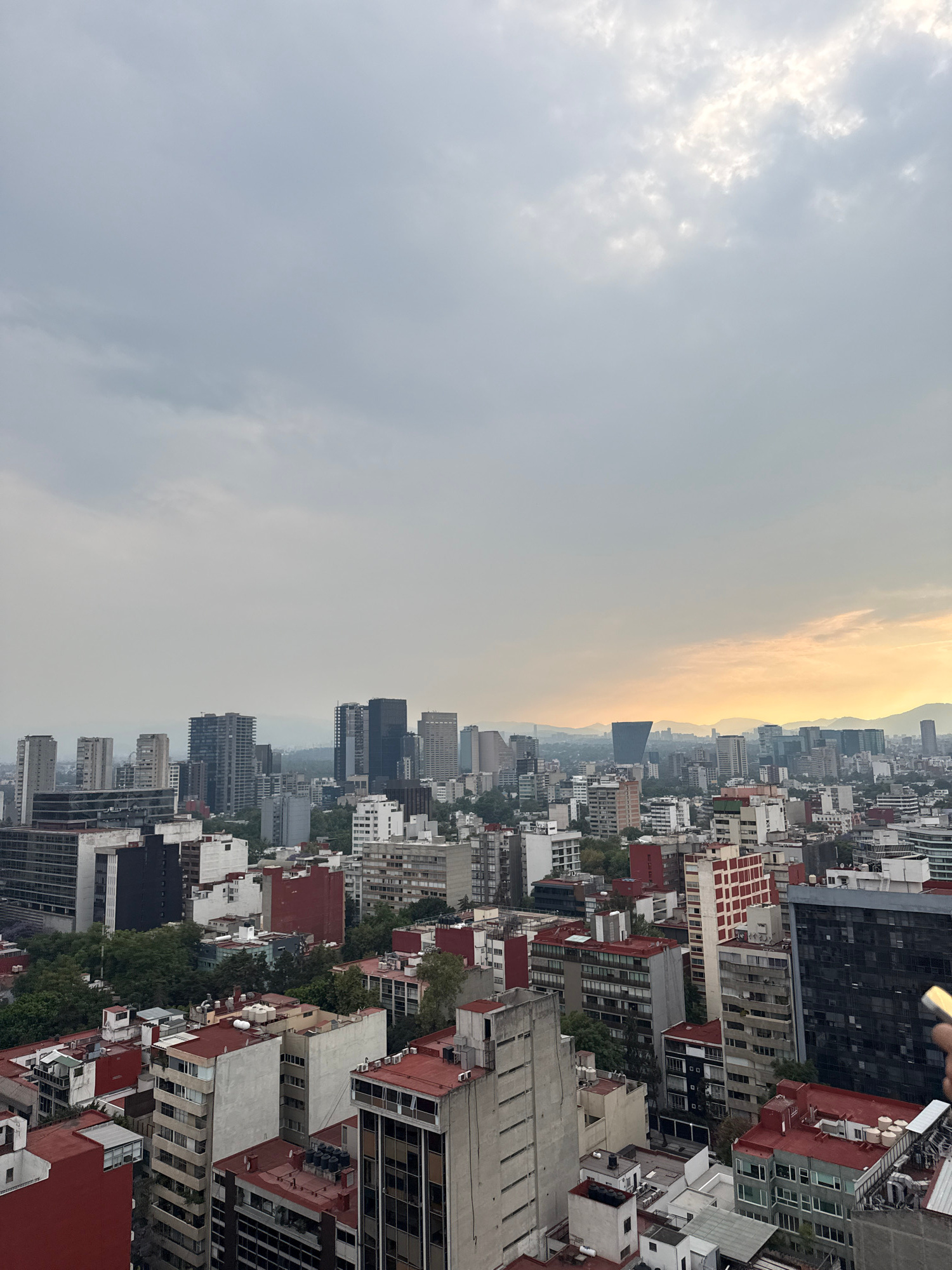 The image is an aerial view of Mexico City, Mexico, showing a dense urban landscape under a sky transitioning from a cloudy gray to a golden-yellow haze. The buildings are predominantly mid-rise to hi…read more