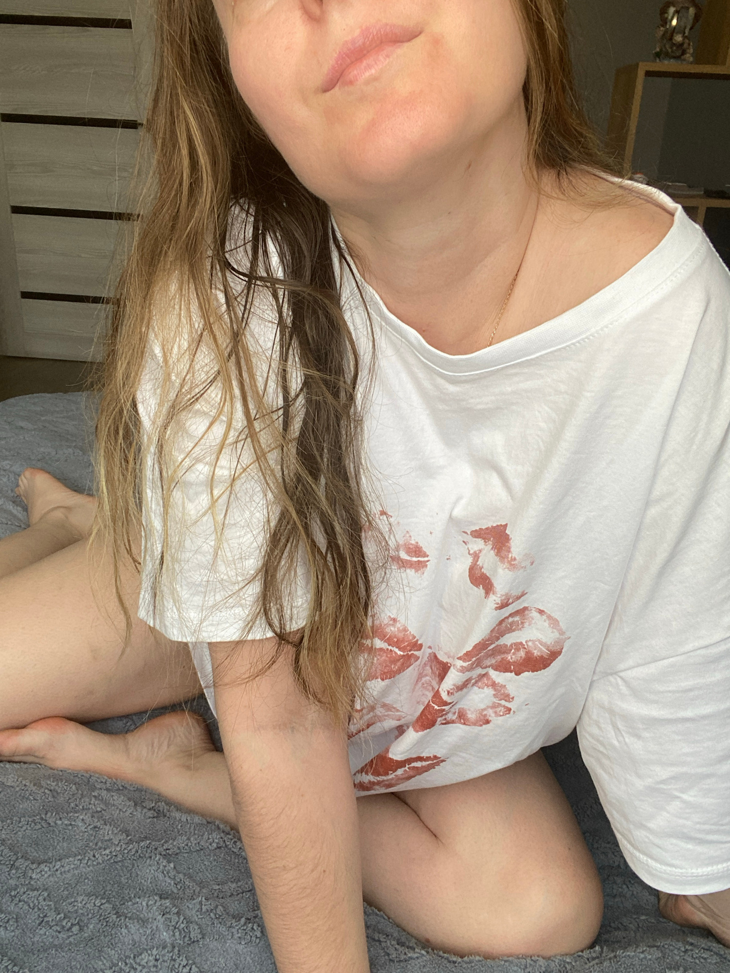 A woman wearing a white t-shirt with lipstick marks is sitting on a gray blanket indoors. The location is not specified.
