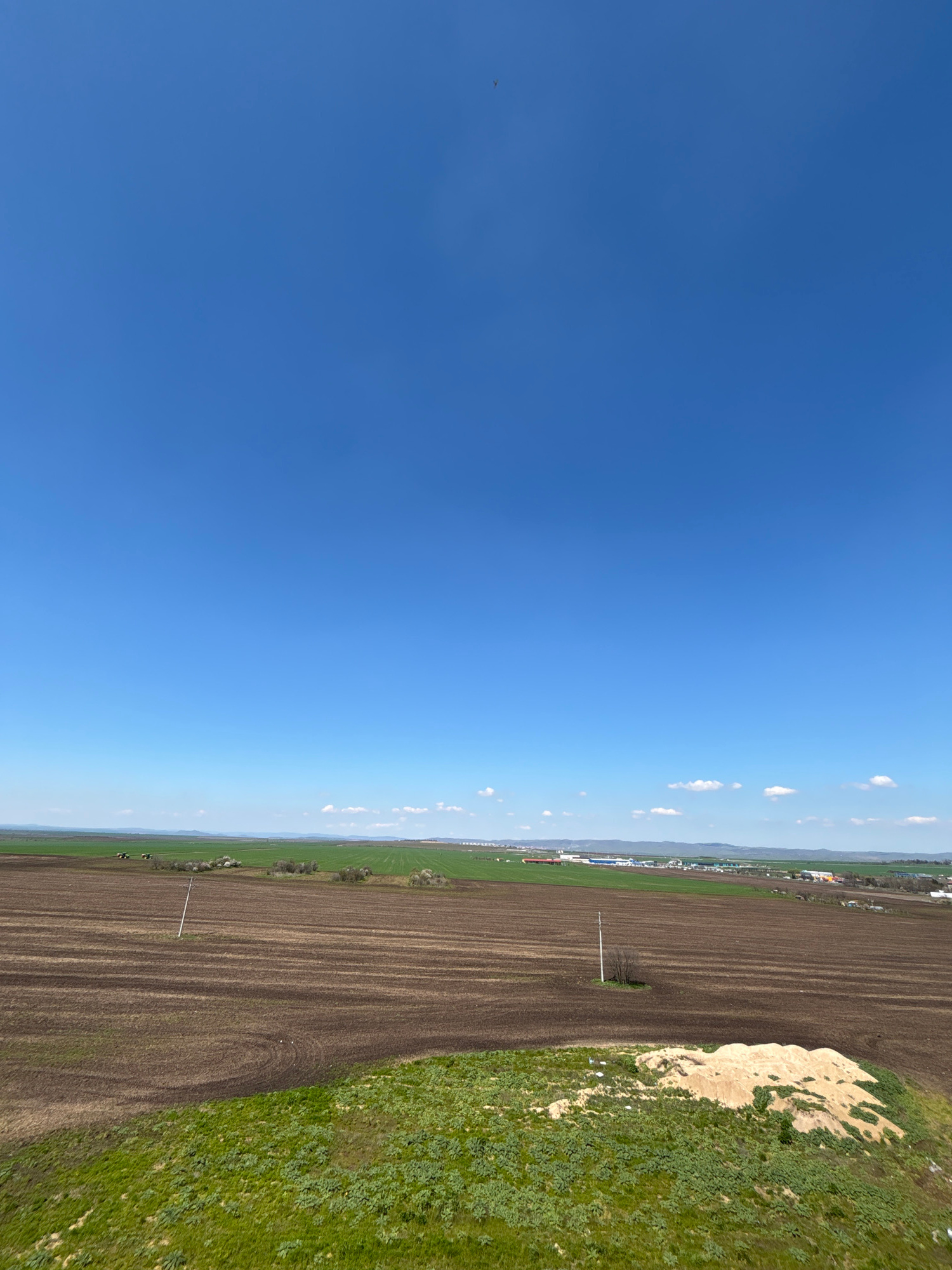 The image shows a landscape with a clear blue sky taking up about half the image. The other half features a view of terrain, including green vegetation, a dark brown field, and a strip of land that se…read more