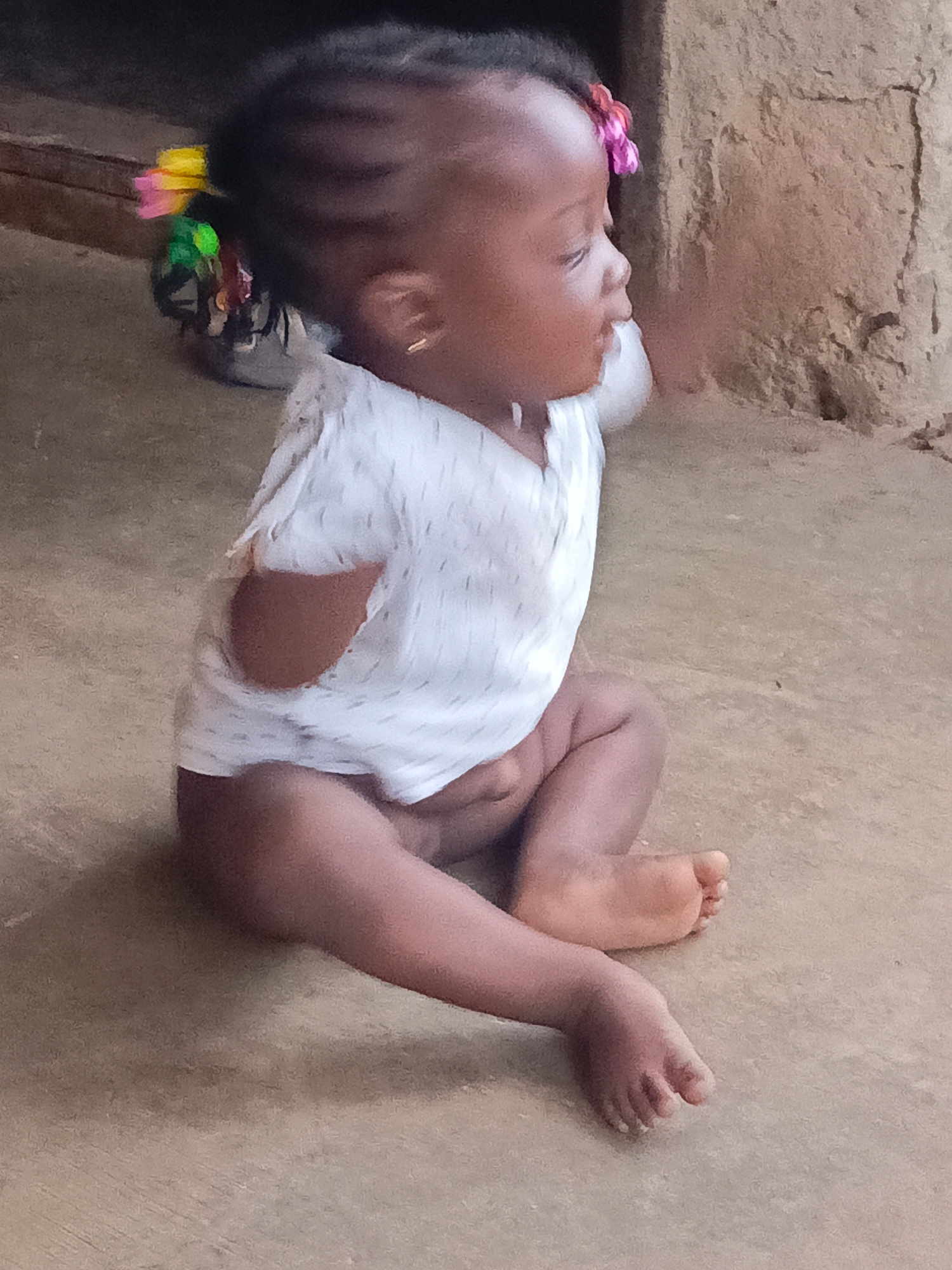 The image depicts a young child, likely a baby, sitting on what appears to be a concrete or stone floor. The child is dark-skinned and has braided hair adorned with colorful hair accessories. She wear…read more