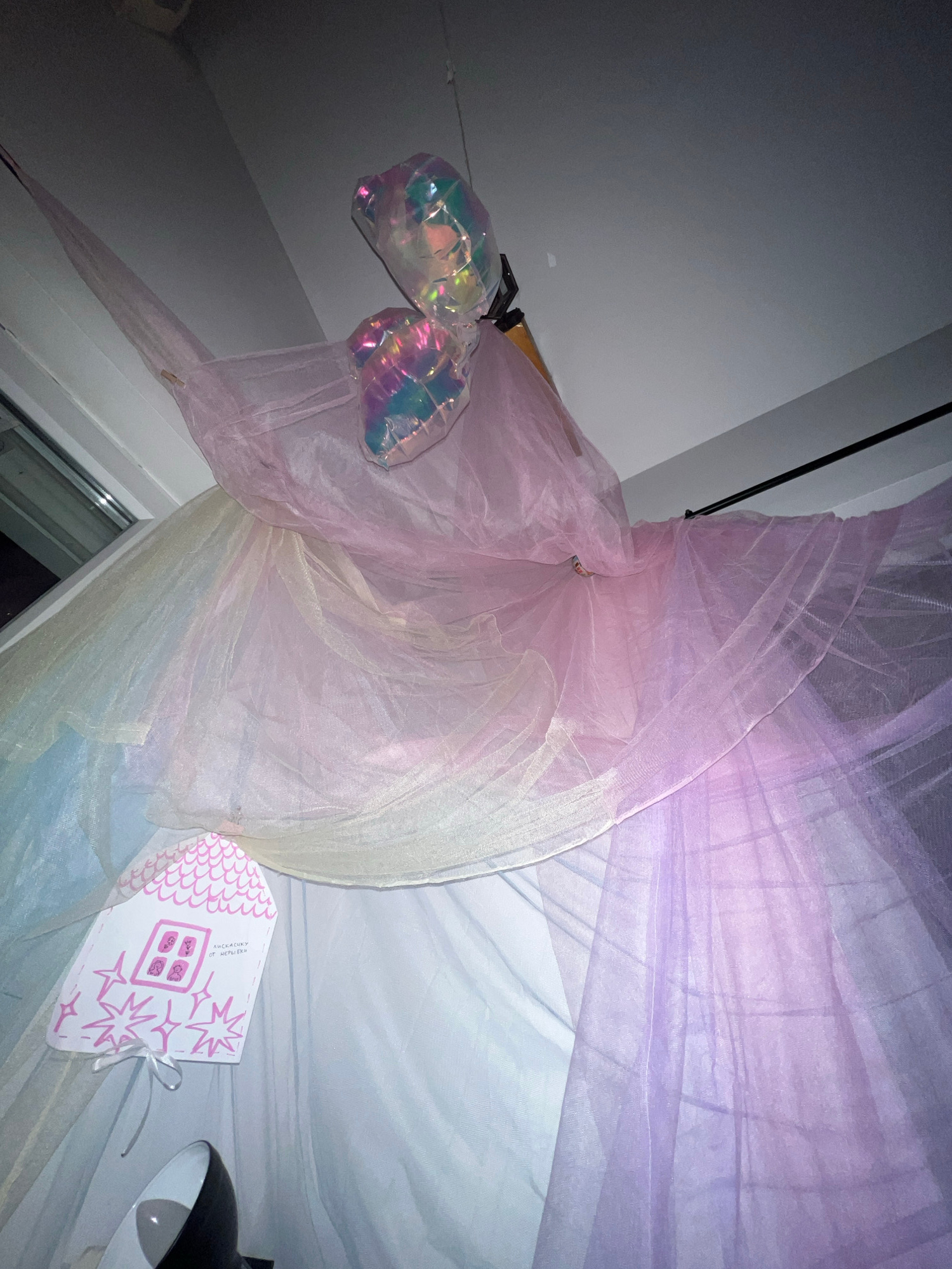 A low-angle indoor shot shows a window adorned with pink and purple sheer fabric. Two iridescent balloon-like objects hang near the window. To the right, a white gift bag with pink designs and a tiedβ¦read more