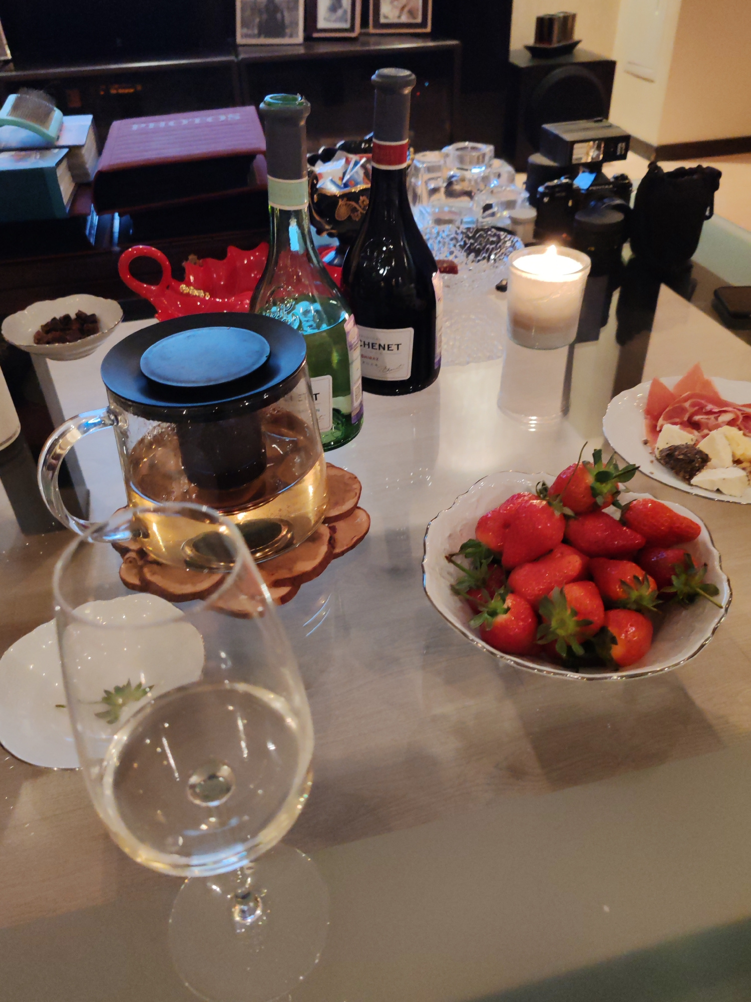 The image depicts a tabletop still life. A glass of clear liquid, possibly wine, stands in the foreground, slightly out of focus. Next to it is a small white plate. A glass teapot filled with tea sits…read more