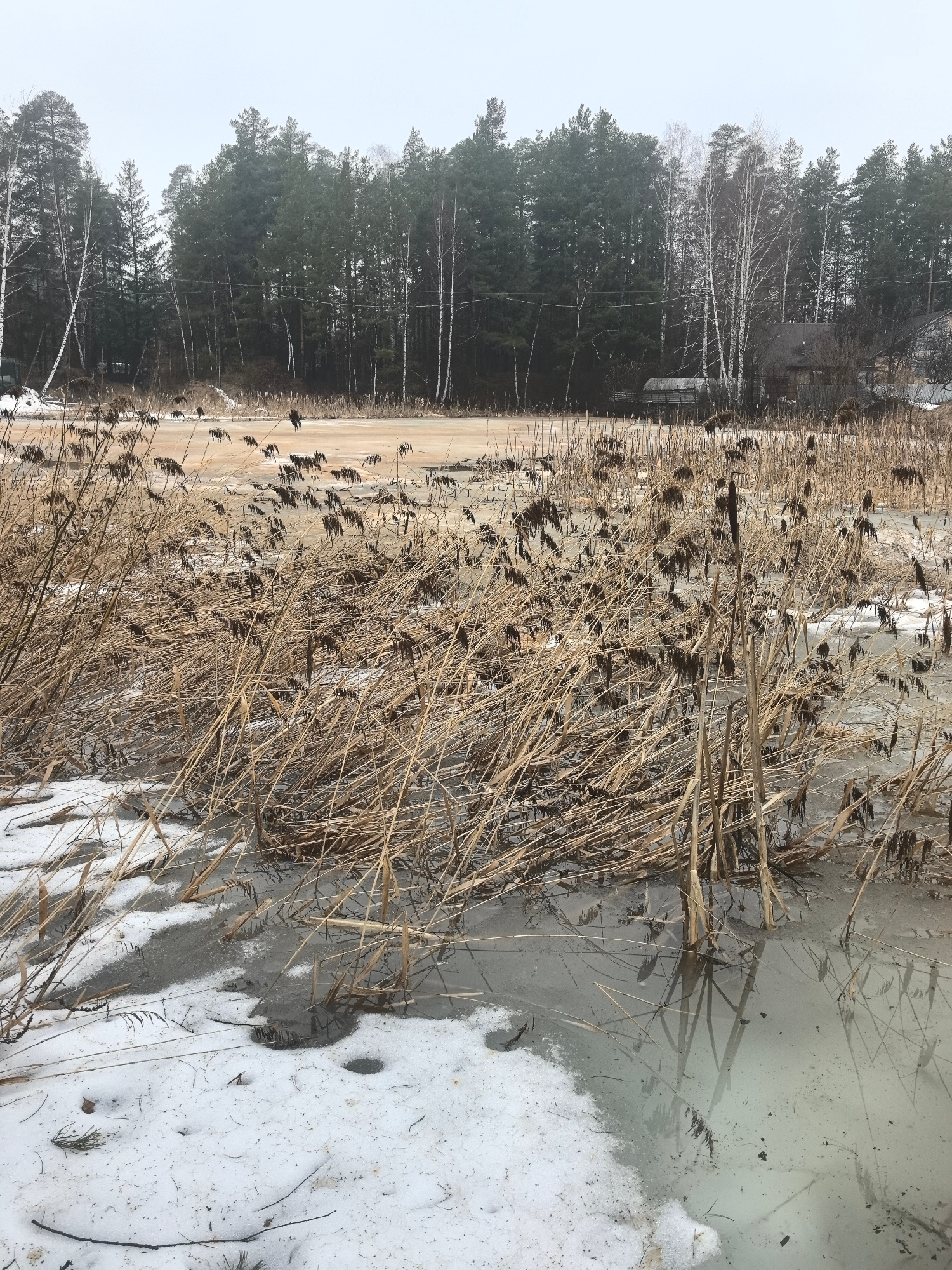 The image depicts a wetland landscape in Noviy, Russia, during the late winter or early spring. The foreground shows a partially frozen body of water with patches of snow and ice. Tall, dry reeds and…read more