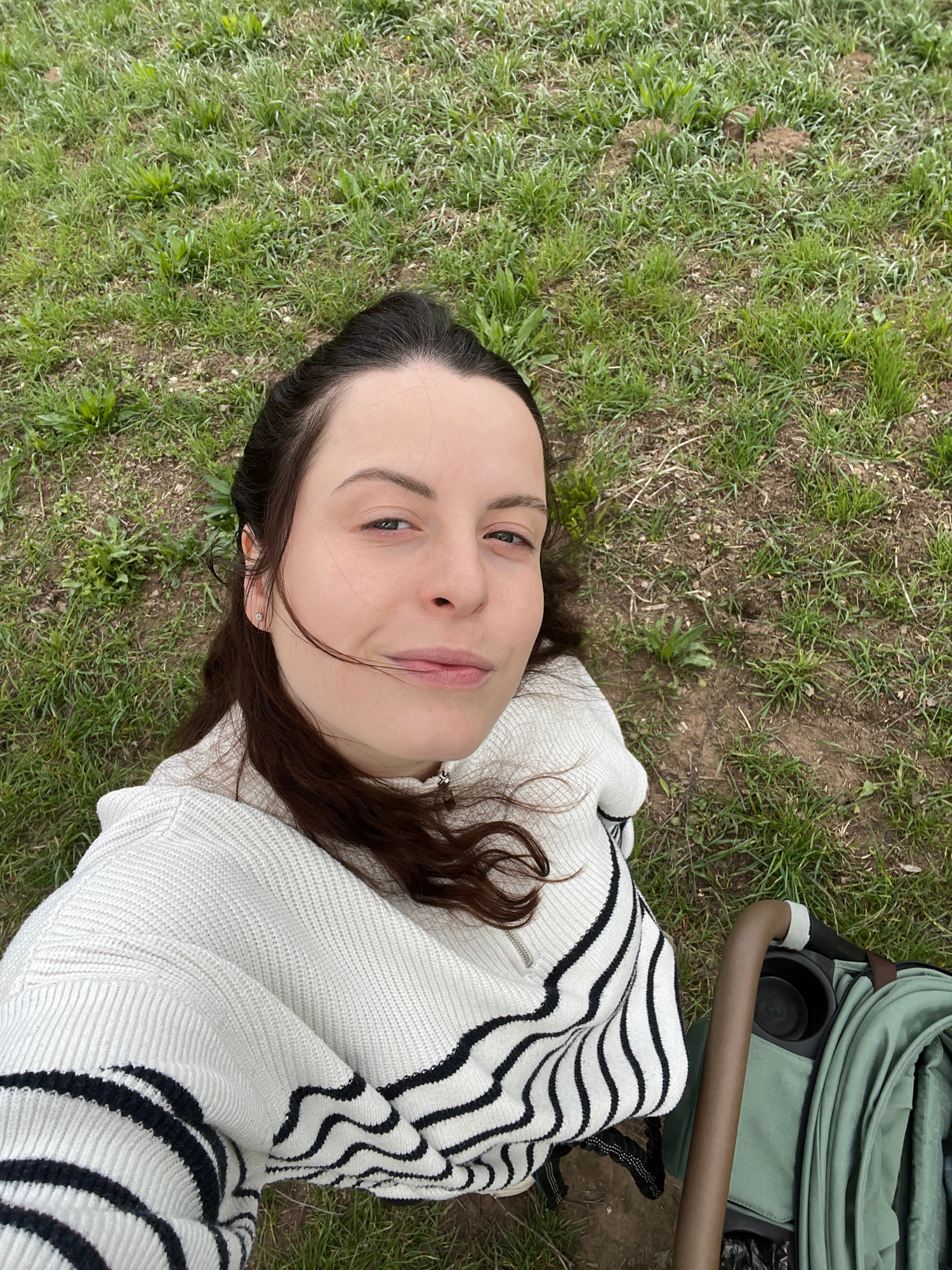 The image shows a woman lying on grass, with a stroller partially visible in the background. The woman has brown hair and is wearing a white sweater with black stripes. The grass appears to be in a pa…read more