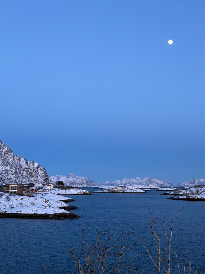 The photo presents a landscape with a clear blue sky where a round moon is visible. The lower half reveals snow-capped mountains and small buildings nestled near a body of water. The water appears dar…read more