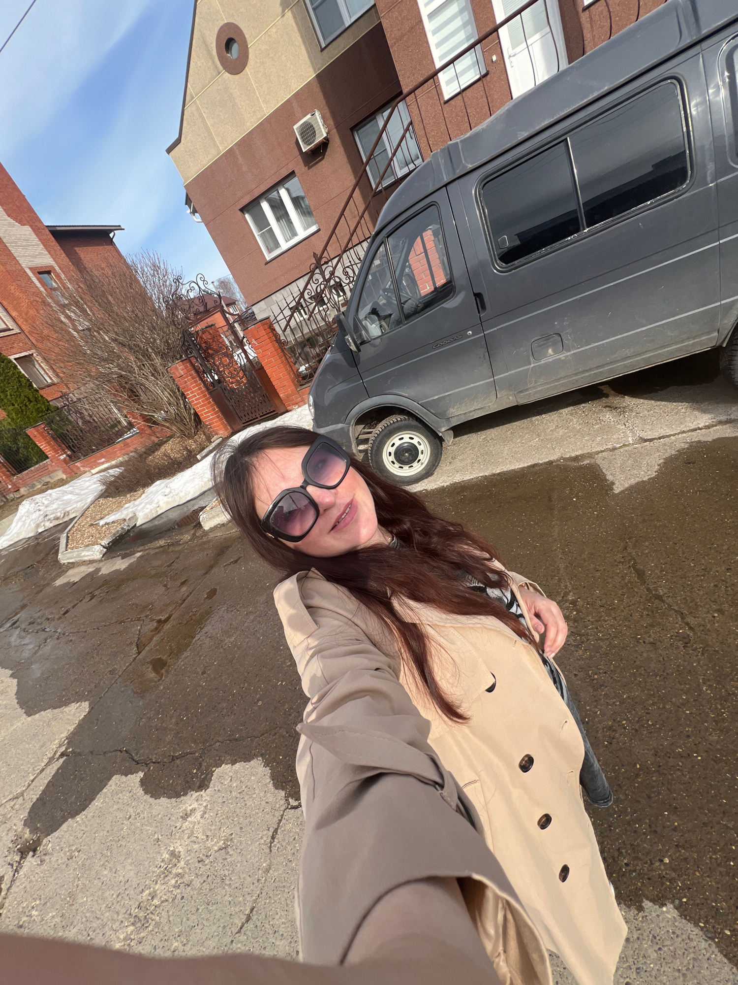 A woman wearing sunglasses and a beige trench coat stands on a wet sidewalk in Noviy, Russia. A gray van is parked nearby, adjacent to buildings of mixed brick and stucco construction, with architectu…read more